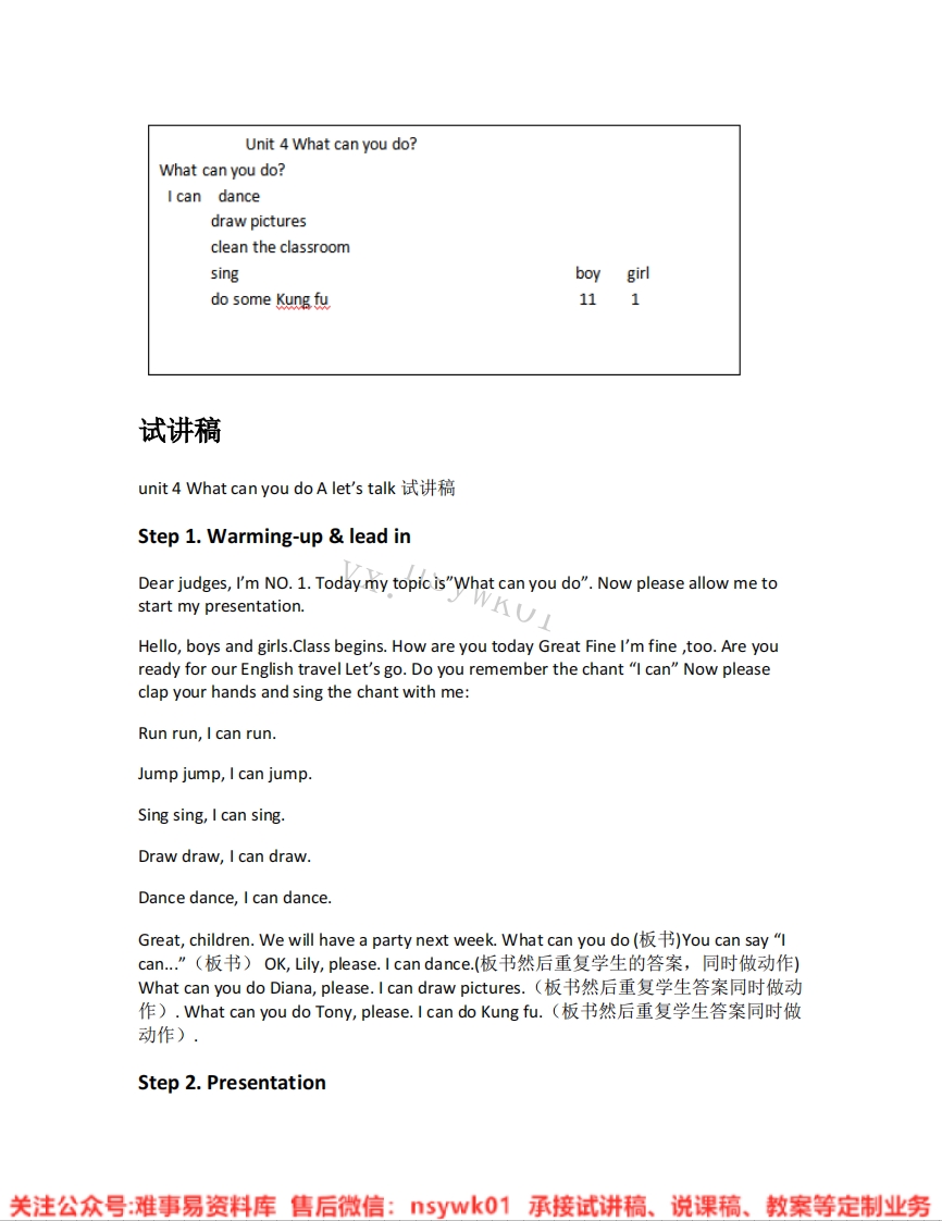 Unit 4 What can you do?What can you do?I can dancedraw picturesclean the classroomsingboy girldo some Kung fu111试讲稿unit4 What can you do A let's talk试讲稿Step 1.Warming-up lead inDear judges,I'm NO.1.Today my topic is"What can you do".Now please allow me tostart my presentation.Hello,boys and girls.Class begins.How are you today Great Fine I'm fine ,too.Are youready for our English travel Let's go.Do you remember the chant "I can"Now pleaseclap your hands and sing the chant with me:Run run,I can run.Jump jump,I can jump.Sing sing,I can sing.Draw draw,I can draw.Dance dance,I can dance.Great,children.We will have a party next week.What can you do ()You can say "Ican”(板书)OK,Lily,please..I can dance..(板书然后重复学生的答案,同时做动作)What can you do Diana,please.I can draw pictures.(板书然后重复学生答案同时做动作).What can you do Tony,,please.I can do Kung fu.(板书然后重复学生答案同时做Step 2.Presentation关注公众号:难事易资料库售后微信:5ywk01承接试讲稿、说课稿、教案等定制业务Great,children,you are very helpful.Look at this picture.Who is the boy Yes,he is ourfriend,Mike.What can Mike doDo you knowNow open your book and find the Let's try.Let's listen to the tape and find the answer.The recording is over.Who can tell me theanswer Do you want to have a PK We have two groups,girls group and boys group.OK,Diana,please.Yes,he can dance.You are right,sit down please.The girls group gets onepoint.OK,boys and girls,look here.We have two new friends.They are Zhang Peng and John.What can they do Do you know Now let's listen to the dialogue to find the answer.Stophere,the recording is over.Who can tell me the answer Wow,James,you are the first toraise your hand.Tell me.What can Zhang Peng do Yes,Zhang Peng can sing.The boysgroup gets one point.I know you can sing,too.What can you do I can sing.(板书然后重复学生答案同时做动作)Next question,what can John do David,please.Yes,he can do some kung fu ()The boys group gets another point.Then what can you do I can do some kung fu.然后边重复学生答案,边做动作)Now,let's see which group is the winner.Wow,the boys group is the winner.Congratulations.Step 3.PracticeMy boys and girls,let's do some exercise together.First,work in pairs to practice the sentences by asking and answering.2 minutes foryou.Let's go.Everybody,you are so active.Now,please listen to the dialogue again and follow it.Payattention to the pronunciation and intonation.Here we go.OK,stop here.I'll give you 3 minutes to make a new dialogue according to the sentencepatterns.Ding-dong,time is up.Who wants to try Wow,so many of you want to showyour dialogue!So how about the game "hot potato"Here is the potato.Remember it isso hot that you have to pass it one by one quickly.But when I say stop,the pair who areholding the potato will have the chance to have the show.Clear Ready Go.Go gogo,stop.Wow,Tim got it.You and your partner show your dialogue with us.Let's getstarted.The other students,please listen carefully.Everyone,do you like theirperformance I like it,too.They both did it very well.Let's clap for them.Step 4.ProductionOK,now there is a task needing your help.At the beginning of the class,I said our schoolwould have a party next week.We need some actors and actresses.So we need a关注公众号:难事易资料库售后微信:5ywk01承接试讲稿、说课稿、教案等定制业务