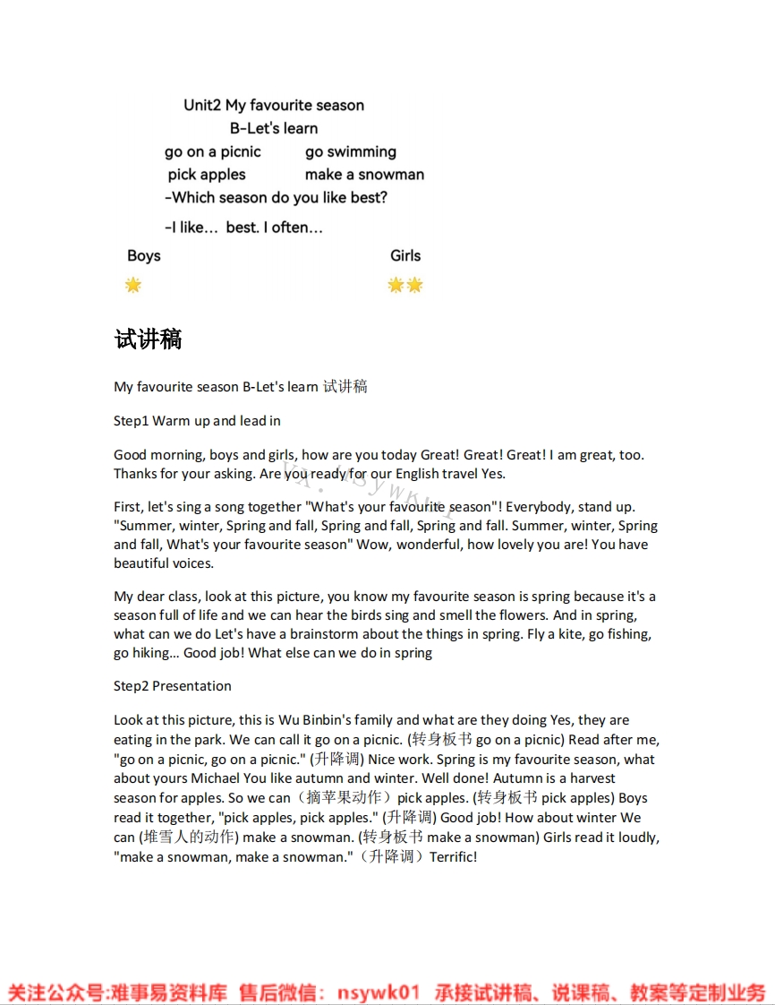 Unit2 My favourite seasonB-Let's learngo on a picnicgo swimmingpick applesmake a snowman-Which season do you like best?-I like...best.I often...BoysGirls试讲稿My favourite season B-Let's leam试讲稿Step1 Warm up and lead inGood morning,boys and girls,how are you today Great!Great!Great!I am great,too.Thanks for your asking.Are you ready for our English travel Yes.First,let's sing a song together "What's your favourite season"!Everybody,stand up"Summer,winter,Spring and fall,Spring and fall,Spring and fall.Summer,winter,Springand fall,What's your favourite season"Wow,wonderful,how lovely you are!You havebeautiful voices.My dear class,look at this picture,you know my favourite season is spring because it's aseason full of life and we can hear the birds sing and smell the flowers.And in spring,what can we do Let's have a brainstorm about the things in spring.Fly a kite,go fishing,go hiking...Good job!What else can we do in springStep2 PresentationLook at this picture,this is Wu Binbin's family and what are they doing Yes,they areeating in the park.We can call it go on a picnic..(转身板书go on a picnic))Read after me,"go on a picnic,go on a picnic."(Nice work.Spring is my favourite season,whatabout yours Michael You like autumn and winter.Well done!Autumn is a harvestseason for apples.So we can(摘苹果动作)pick apples..(转身板书pick apples)Boysread it together,"pick apples,pick apples."()Good job!How about winter Wecan(堆雪人的动作)make a snowman.(转身板书make a snowman)Girls read it loudly,"make a snowman,make a snowman."(升降调)Terrific!关注公众号:难事易资料库售后微信:5ywk01承接试讲稿、说课稿、教案等定制业务Then,listen!What can you hear Yeah,the sound of the seawater.What can we do in thesea You have fast reaction.We can go swimming.(转身板书go swimming)Read itloudly,"go swimming,.go swimming."(升降调)Good pronunciation.Now,it's exciting time.Let's chant together!Please stand up and clap your hands."Go,go,go,let's go,go on a picnic,go swimming,too.Pick,pick,pick,let's go,pick apples,doyou want to Make,make,make,let's go,make a snowman,do you want to"Oh,myboys and girls,you did such a wonderful job!After learning the new phrases,let's meet our old friends "Mike and Wu Binbin".Now,they are also talking about their favourite seasons.Let's listen to their dialogue andanswer the following questions on the powerpoint:Which season does Wu Binbin like best WhyThe dialogue is over,who wants to have a try Lucy,you are so fast.He likes spring best.Why Because there are beautiful flowers everywhere.He often goes on a picnic with hisfamily.Nice!Sit down!My class,according to the dialogue.Do you know how to ask andanswer about people's favourite seasons Good point!We can ask"Which season do youlike best"And how to answer this question You are so smart.We can use"I likespring/summer/autumn/winter best."Also,we can give some reasons or talk about thethings we often do in our favourite season,For example,I often.(与学生互动问答时及时板书句型)Do you understand Excellent!OK,read the sentence pattern loudly afterme.Good pronunciation!Step3 PracticeSince we have learned the new phrases and the sentence pattern,let's do somepractice.First,let's play a game "Phrases competition"to practise the new phrases.I will divideyou into two groups,,boys group and girls group.(板书上呈现分组)Are you ready Let'sgo.Number 1,what is it Great,girls got it,it's "make a snowman".Number 2,what is itWow,my boys got it.It's "go swimming".And the last one,what is it Good,girls got itagain.It's "pick apples".We see girls are the winners,let's clap for them.Boys,nevermind,come on next time.Then,work in pairs to role play the dialogue and make up a new conversation based onit.6 minutes for you,let's begin.OK,have you finished Who wants to share yourconversation with us Wow,so many of you put up your hands,who should I choose Howabout the game "Hot potato"Here is a ball on my hand,remember,it is a hot potato,soplease pass it one by one as quickly as you can.Are you ready Let's go.(面向黑板拍手)OK,stop,Jason and your partner,please,you are so lucky.Marvelous dialogue.Sitdown.They said "Which season do you like best I like summer best.I often eat icecream."关注公众号:难事易资料库售后微信:5ywk01承接试讲稿、说课稿、教案等定制业务
