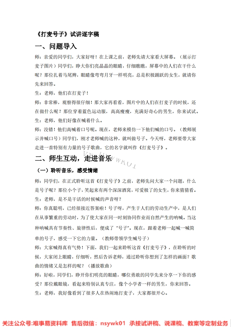 《打麦号子》试讲逐字稿一、问题导入师:亲爱的同学们,大家好呀!在上课之前,老师先请大家看大屏幕。(展示打麦子图片)同学们,睁大你们亮晶晶的眼晴,仔细瞧瞧,屏幕中的人们在干什么呢?那位扎着马尾辫,眼睛像弯弯月牙一样明亮,总是积极踊跃的女生,就请你先来回答。生:老师,他们在打麦子!师:非常棒,观察得很仔细!那大家再看看,图片中的人们在打麦子的时候,还在做什么呢?那位穿着蓝色运动服,高高瘦瘦,充满好奇心的男生,你来试试。生:老师,他们好像在喊着什么。师:没错!他们高喊着口号呢。现在,老师来模仿一下他们喊的口号。(教师展示并喊口号)同学们,刚才老师喊的这种,就叫做号子。今天呀,老师要带大家走进一首特别有力量的号子歌曲,它的名字就叫作《打麦号子》。二、师生互动,走进音乐U(一)聆听音乐,感受情绪师:同学们,在正式聆听这首《打麦号子》之前,老师先问大家一个问题,什么是号子呢?那位小个子,笑起来有两个深深酒窝,可爱极了的女生,你来猜猜看。生:老师,是不是干活的时候喊的声音呀?师:你真聪明,已经很接近答案啦!号子呀,产生于人们的劳动生产中,是人们在从事繁重的劳动时,为了使大家在同一时刻协同作业而自然产生的呐喊。当这种呐喊具有节奏性、旋律性后,便成了“号子“。现在,跟着老师一起喊一喊简单的号子,感受一下它的力量。(教师带领学生喊号子)师:大家喊得真有气势!下面,我们一起来聆听这首《打麦号子》,在聆听的时候,大家闭上眼睛,仔细听,然后告诉老师,通过聆听你想到了怎样的画面?歌曲的情绪又是怎样的呢?(播放歌曲)师:好啦,同学们,睁开你们明亮的眼晴,哪位勇敢的同学先来分享一下你的感受?那位戴眼镜,看起来特别认真专注,像个小学者一样的男生,你来回答。生:老师,我好像看到了很多人在热闹地打麦子,大家都很开心。关注公众号:难事易资料库售后微信:5yk01承接试讲稿、说课稿、教案等定制业务师:非常好的感受!还有不同想法的同学吗?请那位穿红色连衣裙,看起来机灵聪慧,像个小精灵一样的女生回答。生:老师,我觉得歌曲的情绪很热烈,让人听了也想跟着一起劳动。师:大家说得都很准确!这首《打麦号子》便是在劳动的背景下产生的一首江苏民歌,它体现了劳动人民的智慧和力量,表现了打麦子的场景。(二)分析音乐,表现音乐师:同学们,《打麦号子》全曲可以分为两个部分。前8小节没有旋律,都是按均衡的八分节奏进行劳动的呐喊,烘托了热火朝天的劳动场面。现在,我们一起把这前8小节的呐喊喊出来,感受一下那种热烈的氛围。(教师带领学生喊前8小节号子)师:大家喊得太棒了,仿佛真的把我们带到了打麦场!接下来,《打麦号子》具有新颖的一领众和、说唱结合的特点,气氛热烈。中间8小节发展成2+2+2+2的结构,有了旋律,就采用二领众和的演唱形式。现在,我们先来学唱第三乐句。大家跟着老师的钢琴,仔细听,认真唱。《教师弹琴,学生跟琴学唱第三乐句)师:同学们学得真快,第三乐句唱得很不错!现在,我们把歌词填进去,试着演唱这一乐句。(学生填词演唱第三乐句)师:非常棒!下面,请同学们跟着琴学唱第四乐句。(学生跟琴学唱第四乐句)师:好,填词演唱第四乐句。(学生填词演唱第四乐句)师:下面学唱最后8小节,这两个乐句是中间8小节的反复。我们先跟琴演唱第五乐句。(学生跟琴演唱第五乐句)师:现在填词演唱第五乐句。(学生填词演唱第五乐句)师:下面跟琴演唱第六乐句。(学生跟琴演唱第六乐句)师:填词演唱第六乐句。(学生填词演唱第六乐句)师:同学们,现在我们已经学会了各个部分,下面我们把整首歌曲完整地演唱一遍,要唱出歌曲中那种热火朝天的劳动热情和团结协作的力量。(学生整体演唱)三、精彩演绎,自由发挥关注公众号:难事易资料库售后微信:5yk01承接试讲稿、说课稿、教案等定制业务