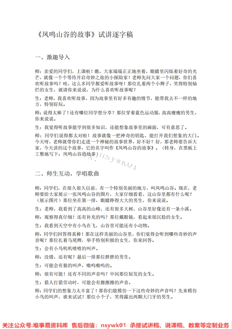 《凤鸣山谷的故事》试讲逐字稿一、激趣导入师:亲爱的同学们,上课啦!瞧,大家端端正正地坐着,眼睛里闪烁着好奇的光芒,就像一个个等待开启奇妙之旅的小探险家!老师先问大家一个问题,你们喜欢听故事吗?哇,这么多同学都爱听故事呀!那位扎着两个小辫子,笑得特别灿烂的女生,就请你来说说,为什么喜欢听故事呢?生:老师,我喜欢听故事,因为故事里有好多有趣的情节,能带我去不一样的地方,特别好玩。师:说得太棒了!还有哪位同学想分享?那位穿着蓝色运动服,高高瘦瘦的男生,你来说说。生:我觉得听故事能学到很多知识,还能想象故事里的画面,可有意思了。师:同学们说得都太对啦!故事就像一把神奇的钥匙,能打开我们想象的大门。今天呀,老师就带你们走进一个神秘的故事世界,好不好?好,那老师要告诉大家,今天讲的这个故事,它的名字叫作《凤鸣山谷的故事》。(转身,在黑板上二、师生互动,学唱歌曲师:同学们,在很久很久以前,有一个特别美丽的地方,叫凤鸣山谷。现在,老师要给大家展示一张凤鸣山谷的图片,大家仔细看看,这山谷里都有什么呢?(展示图片)那位坐在第一排,眼睛睁得大大的男生,你来说说。生:老师,我看到了高高的山峰,还有很多大树,山谷里好像还有一条小溪。师:观察得真仔细!还有补充的吗?那位戴眼镜,看起来很沉稳的女生。生:我看到天空中有小鸟在飞,山谷里可能还有小动物。师:同学们回答得真棒!那在这样美丽的山谷里,你们觉得会听到哪些奇妙的声音呢?那位扎着马尾辫,举手特别积极的女生,你来回答。生:会有小鸟叽叽喳喳的叫声。师:没错,还有呢?最后一排那位胖胖的男生。生:可能会有狼的叫声,嗷鸣嗷鸣的。师:很有可能!还有不同的声音吗?中间那位短发的女生。生:猎人打猎劳动时,可能会有擦擦擦的声音。师:同学们的想象力太丰富了!那你们能模仿一下这些奇妙的声音吗?先来模仿小鸟的叫声,谁来试试?那位小个子,笑得露出两颗大门牙的男生。关注公众号:难事易资料库售后微信:5yk01承接试讲稿、说课稿、教案等定制业务生:叽叽叽,叽叽叽。师:真像!那模仿狼叫声,哪位同学自告奋勇?那位穿着红色衣服的女生。生:嗷鸣,嗷鸣。师:不错!再来模仿猎人劳动的声音,有请那位穿条纹衬衫的男生。生:擦擦,擦擦。师:同学们模仿得惟妙惟肖!现在,请同学们跟着老师一起来模拟一下这些奇妙的声音,并且用老师给出的节奏来打拍子。先看小鸟的节奏,3/4拍,XX0XX0,大家跟着老师一起说,GUGUGUGU。(带领学生打节奏)师:非常好!接下来是狼叫声的节奏,2/4拍,X-X-川,大家一起,嗷嗷。(再次带领学生打节奏)师:真棒!最后是猎人劳动声音的节奏,2/4拍,XX,大家来,擦擦擦擦。(继续带领学生打节奏)师:同学们学得真快!现在,老师为大家准备了三角铁,手铃、碰铃、沙锤、鼓这些乐器,大家可以利用它们来表现我们刚才学到的这些奇妙的声音。小组内可以互相商量,怎么用乐器把声音表现得更生动。(学生们开始尝试用乐器表现声音,教师巡视指导)师:好啦,同学们,老师听到了很多美妙的声音组合。那现在老师想问,大自然的这些声音给你们怎样的感受?你们又想象到了怎样的画面呢?那位穿黄色衣服,总是面带微笑的女生,你来说说。生:老师,我觉得大自然的声音特别美妙,我想象到小鸟在山谷里欢快地飞,狼在远处的山坡上嚎叫,猎人在树林里辛勤地劳动。师:说得太精彩了!还有不同感受和画面的吗?那位戴帽子的男生。生:我感觉这些声音让我好像走进了一个神秘的森林,特别有趣,我想象到小溪潺潺流淌,和这些声音交织在一起。师:同学们的感受和想象都太丰富了!三、精彩演绎,自由发挥师:同学们,刚才大家用乐器表现声音已经很出色了。现在,我们要利用手中的道具和乐器,上台来完整地表现这些奇妙的声音,发挥你们的创造力和想象力,让这个凤鸣山谷的声音世界更加精彩!谁先来?那位勇敢地第一个举手的高个子男生,就请你上台。关注公众号:难事易资料库售后微信:5yk01承接试讲稿、说课稿、教案等定制业务