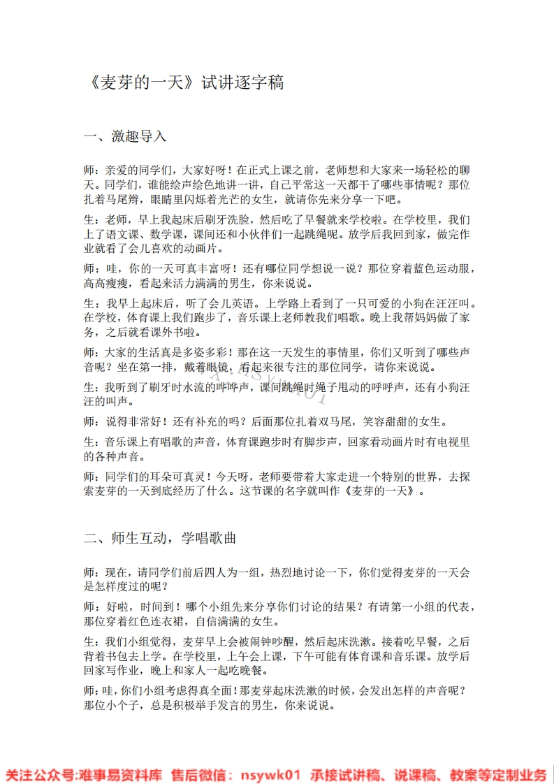 《麦芽的一天》试讲逐字稿一、激趣导入师:亲爱的同学们,大家好呀!在正式上课之前,老师想和大家来一场轻松的聊天。同学们,谁能绘声绘色地讲一讲,自己平常这一天都干了哪些事情呢?那位扎着马尾辫,眼晴里闪烁着光芒的女生,就请你先来分享一下吧。生:老师,早上我起床后刷牙洗脸,然后吃了早餐就来学校啦。在学校里,我们上了语文课、数学课,课间还和小伙伴们一起跳绳呢。放学后我回到家,做完作业就看了会儿喜欢的动画片。师:哇,你的一天可真丰富呀!还有哪位同学想说一说?那位穿着蓝色运动服,高高瘦瘦,看起来活力满满的男生,你来说说。生:我早上起床后,听了会儿英语。上学路上看到了一只可爱的小狗在汪汪叫。在学校,体育课上我们跑步了,音乐课上老师教我们唱歌。晚上我帮妈妈做了家务,之后就看课外书啦。师:大家的生活真是多姿多彩!那在这一天发生的事情里,你们又听到了哪些声音呢?坐在第一排,戴着眼镜,看起来很专注的那位同学,请你来说说。生:我听到了刷牙时水流的哗哗声,课间跳绳时绳子甩动的呼呼声,还有小狗汪汪的叫声。师:说得非常好!还有补充的吗?后面那位扎着双马尾,笑容甜甜的女生。生:音乐课上有唱歌的声音,体育课跑步时有脚步声,回家看动画片时有电视里的各种声音。师:同学们的耳朵可真灵!今天呀,老师要带着大家走进一个特别的世界,去探索麦芽的一天到底经历了什么。这节课的名字就叫作《麦芽的一天》。二、师生互动,学唱歌曲师:现在,请同学们前后四人为一组,热烈地讨论一下,你们觉得麦芽的一天会是怎样度过的呢?师:好啦,时间到!哪个小组先来分享你们讨论的结果?有请第一小组的代表,那位穿着红色连衣裙,自信满满的女生。生:我们小组觉得,麦芽早上会被闹钟吵醒,然后起床洗漱。接着吃早餐,之后背着书包去上学。在学校里,上午会上课,下午可能有体育课和音乐课。放学后回家写作业,晚上和家人一起吃晚餐。师:哇,你们小组考虑得真全面!那麦芽起床洗漱的时候,会发出怎样的声音呢?那位小个子,总是积极举手发言的男生,你来说说。关注公众号:难事易资料库售后微信:5yk01承接试讲稿、说课稿、教案等定制业务生:刷牙会有刷刷刷的声音,洗脸会有哗哗的水声,还有挤牙膏时的滋滋声。师:模仿得很形象!那上学的路上,麦芽又可能会发现什么声音呢?请那位坐在窗边,眼睛明亮的女生回答。生:可能会听到汽车的喇叭声,嘟嘟嘟。还可能听到小鸟叽叽喳喳的叫声,说不定还有风吹树叶沙沙沙的声音。师:非常棒!那体育课上,麦芽会发现什么声音呢?那位穿条纹衬衫,平时很爱运动的男生,你来回答。生:会有跑步时的脚步声,咚咚咚。还有同学们喊口号的声音,一二一、一二一。如果在踢球,还会有球被踢出去的砰砰声。师:太对啦!那音乐课上,麦芽又会发现什么声音呢?有请那位嗓音特别甜美的女生。生:会有老师弹钢琴的声音,叮叮咚咚。同学们唱歌的声音,还有拍手打节奏的啪啪声。师:同学们的想象力太丰富了!那现在,大家能不能模仿一下这些声音呢?先来模仿刷牙的声音,谁来试试?那位穿黄色衣服的男生。生:(做出刷牙的动作,发出声音)刷刷刷,刷刷刷。师:很像!那模仿汽车喇叭声,有请那位高高壮壮的男生。师:太像了!还有模仿跑步脚步声的,那位活泼好动的女生。生:(一边跺脚一边说)咚咚咚,咚咚咚。师:同学们模仿得惟妙惟肖!声音在我们的周围无处不在,大家一定要善于发现并感知声音的存在哦。三、精彩演绎,自由发挥师:同学们,刚才大家对麦芽一天中的声音已经有了很生动的想象和模仿。现在,老师为大家准备了各种各样的道具和乐器,大家可以利用它们上台来表现麦芽的一天,充分发挥你们的想象力和创新能力,把麦芽这一天的经历用声音生动地展现出来!谁先来?那位勇敢地第一个举手,充满自信的高个子男生,就请你上台。师:哇,你用道具和乐器完美地演绎了麦芽的一天,从起床的声音到上学路上,再到学校里的各种声音,太有创意了!还有哪位同学想上台展示?请那位扎着丸子头,活力四射的女生。师:太棒了,你的表演让我们仿佛真的看到了麦芽丰富多彩的一天,每一个声音都那么贴切,太精彩了!四、课堂小结关注公众号:难事易资料库售后微信:5yk01承接试讲稿、说课稿、教案等定制业务