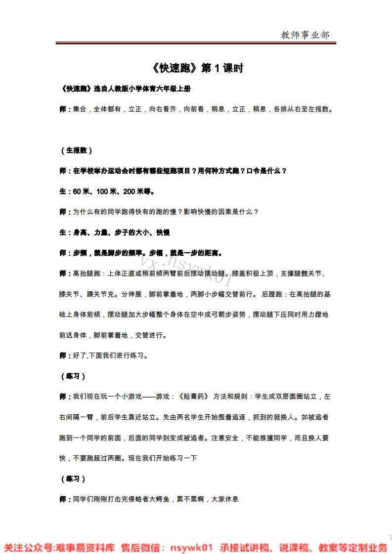 教师事业部《快速跑》第1课时《快速跑》选自人教版小学体青六年级上册师:集合,全体都有,立正,向右看齐,向前看,稍息,立正,稍息,各排从右至左报数。(生报数)师:在学校举办运动会时都有哪些短跑项目?用何种方式跑?口合是什么?生:60米、100米、200米等。师:为什么有的同学跑得快有的跑的慢?影响快慢的因素是什么?生:身高、力量、步子的大小、快慢师:步频,就是脚步的频率。步幅,就是一步的距膏。师:高抬腿跑:上体正直或稍前倾两臂前后摆动摆动腿。膝盖积极上顶,支撑腿髋关节、膝关节、踝关节充。分伸展,脚前掌着地,两脚小步幅交替前行。后蹬跑:在高抬腿的基础上身体前倾,摆动腿加大步幅整个身体在空中成弓箭步姿势,摆动腿下压同时用力蹬地前送身体,脚前掌着地,交替进行。师:好了,下面我们进行练习。(练习)师:我们现在玩一个小游戏一游戏:《贴膏药》方法和规则:学生成双层圆圈站立,左右间隔一臂,前后学生靠近站立。先由两名学生开始围着追逐,抓到的就换人。如被追者跑到一个同学的前面,后面的同学则变成被追者。注意安全,不能推撞同学,而且换人要快,不要跑超过两圈。现在我们开始练习一下(练习)师:同学们刚刚打击完侵略者大鳄鱼,累不累啊,大家休息关注公众号:难事易资料库售后微信:5ywk01承接试讲稿、说课稿、教案等定制业务教师事业部生:好师:好的,同学们,我们转动脚踝和手腕,进行放松师:同学们,今天学快速跑要领,你们学会了么?生:学会了师:今天的课很开心。今天的课就到此为止。师:再见,同学们!生:再见,老师!关注公众号:准事易资料库售后微信:5ywk01承接试讲稿、说课稿、教案等定制业务