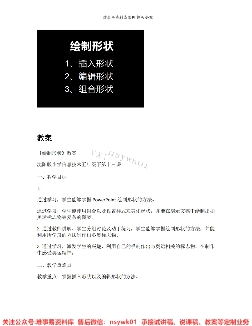 难事易资料库整理侵权必究绘制形状1、插入形状2、编辑形状3、组合形状教案《绘制形状》教案沈阳版小学信息技术五年级下第十三课一、教学目标1.通过学习,学生能够掌握PowerPoint绘制形状的方法。通过学习,学生能使用组合以及设置样式来美化形状,并能在演示文稿中绘制出如奥运标志物等复杂的图案。2.通过教师讲解、学生分组讨论及动手练习,学生能够掌握绘制形状的方法,并能利用所学习的方法制作出冬奥标志物。3.通过学习,激发学生的兴趣,利用自己的手制作出与奥运相关的标志物,在制作中感受奥运精神。二、教学重难点教学重点:掌握插入形状以及编辑形状的方法。关注公众号:难事易资料库售后微信:5ywk01承接试讲稿、说课稿、教案等定制业务难事易资料库整理侵权必究教学难点:在演示文稿中利用所学习的方法制作出如奥运相关的标志物等复杂的图案。三、教学过程(一)导入视频导入:教师询问学生既举办过奥运会又举办过冬奥会的城市是哪个?(北京),然后通过多媒体播放一段2008年北京奥运会的视频。引导学生观察奥运会都有哪些标志物?(奥运五环、吉祥物等)他们是怎么制作出来的呢?(画图软件、Word等)。接着提出疑问:PowerPoint是否可以绘制形状。最后,引出本节课的课题,利用PowerPoint绘制形状。(二)教授新课1.插入形状(1)教师出示图片,引导学生观察并说出图案的组成。观察奥运五环的组成,说一说自己的发现,教师归纳出奥运五环要用到五个圆,分别是红黄黑蓝绿。(3)教师进行演示如何用PowerPoint绘制圆环。/(4)学生仿照教师的演示绘制出圆环,并激发学生绘制出更多的形状,教师巡视指导。2.编辑形状(1)教师展示绘制的圆环,引导学生发现区别。(填充了不同的颜色)(2)引导学生自主探究:基于之前学习过画图软件探究怎么将五环绘制出不同的颜色?(在“格式选项卡”上“形状样式进行设置)(3)学生通过自己尝试填充颜色,熟悉形状样式上有哪些功能,选出学生进行演示并总结。3.组合形状(1)教师展示图片并提出问题:怎么将圆环组合起来。(2)小组讨论如何进行组合形状,小组派代表进行总结并演示。(3)学生自行练习,并将制作的五环组合在一起,制作出奥运五环。关注公众号:难事易资料库售后微信:Sywk01承接试讲稿、说课稿、教案等定制业务