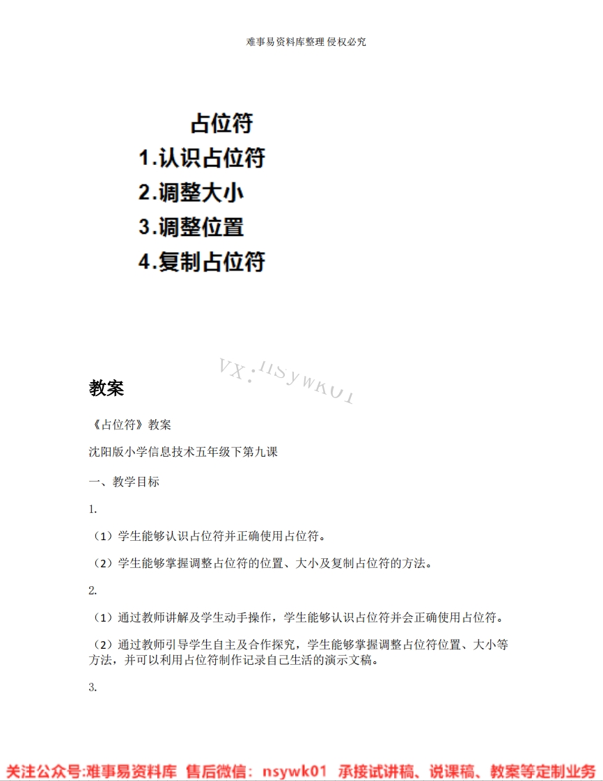 难事易资料库整理侵权必究占位符1.认识占位符2.调整大小3.调整位置4.复制占位符教案《占位符》教案沈阳版小学信息技术五年级下第九课一、教学目标1.(1)学生能够认识占位符并正确使用占位符。(2)学生能够掌握调整占位符的位置、大小及复制占位符的方法。2.(1)通过教师讲解及学生动手操作,学生能够认识占位符并会正确使用占位符。(2)通过教师引导学生自主及合作探究,学生能够掌握调整占位符位置、大小等方法,并可以利用占位符制作记录自己生活的演示文稿。3.关注公众号:难事易资料库售后微信:5ywk01承接试讲稿、说课稿、教案等定制业务难事易资料库整理侵权必究(1)通过学习,激发学生的兴趣,培养学生的动手、动脑的能力。(2)引导学生在制作演示文稿的过程中,学会观察生活、记录生活、热爱生活。二、教学重难点教学重点:认识占位符及正确使用占位符。教学难点:掌握调整的占位符位置、大小以及复制的方法。三、教学过程(一)导入作品导入:教师谈论新冠肺炎并询问学生对于新冠肺炎印象深刻的一点是什么?(医护人员、口罩、居民出入证),然后教师通过展示自己制作的一个有关新冠肺炎的演示文稿,接着提出疑问:想一想怎么在文稿中插入图片和文字?最后,引出本节课的课题,要想插入图片与文字要认识一个新朋友一一占位符。(二)教授新课1.认识占位符(1)复习上节课学习的内容:新建一个演示文稿。(2)教师引导学生仔细观察演示文稿的编辑区,说一说发现。(虚线框)(3)教师介绍占位符以及占位符的作用。2.调整占位符大小(1)教师播放在占位符中插入文字的视频,引导学生仔细观看。(2)学生仿照视频内的方法将D盘《加油中国》的文字粘贴在占位符中。(3)学生通过自己尝试发现问题:占位符无法显示全部文字内容。引导学生相互帮助,解决问题。(4)学生进行演示,教师总结点评。3.调整占位符位置(1)教师提出问题:想将粘贴的文字放在演示文稿的中间应该怎么做呢?引导学生解决问题。教师演示操作步骤。关注公众号:难事易资料库售后微信:5ywk01承接试讲稿、说课稿、教案等定制业务