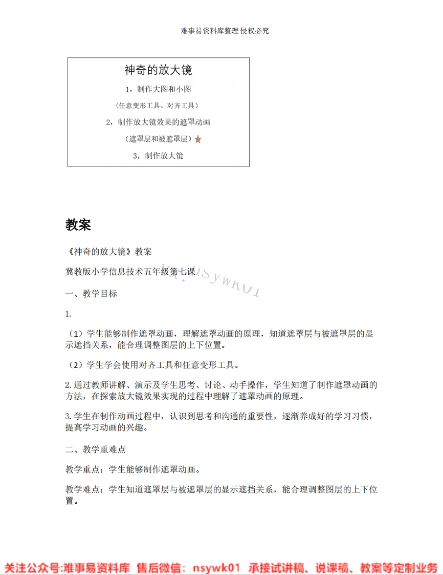 难事易资料库整理侵权必究神奇的放大镜1,制作大图和小图(任意变形工具、对齐工具)2,制作放大镜效果的遮罩动画(遮罩层和被遮罩层)★3,制作放大镜教案《神奇的放大镜》教案一、教学目标1.(1)学生能够制作遮罩动画,理解遮罩动画的原理,知道遮罩层与被遮罩层的显示遮挡关系,能合理调整图层的上下位置。(2)学生学会使用对齐工具和任意变形工具。2.通过教师讲解、演示及学生思考、讨论、动手操作,学生知道了制作遮罩动画的方法,在探索放大镜效果实现的过程中理解了遮罩动画的原理。3.学生在制作动画过程中,认识到思考和沟通的重要性,逐渐养成好的学习习惯,提高学习动画的兴趣。二、教学重难点教学重点:学生能够制作遮罩动画。教学难点:学生知道遮罩层与被遮罩层的显示遮挡关系,能合理调整图层的上下位置。关注公众号:难事易资料库售后微信:5ywk01承接试讲稿、说课稿、教案等定制业务难事易资料库整理侵权必究三、教学过程(一)导入实物导入:通过展示放大镜,提问学生放大镜的作用(放大镜放于物体前适当距离即可从透镜内看到被放大的物体影像),之后引导学生猜测思考在ash中能否实现放大镜的动画效果?学生回答后,教师利用多媒体播放展示制作的放大镜效果动画,引起学生的兴趣,自然引出本节课的课题。(二)教授新课1.制作大图和小图(1)教师再次播放动画,学生观察并思考分析如何制作放大镜效果的动画,教师提问学生回答最后师生总结,先要有两张图像(需要放大的图像和放大后的图像),再利用大图制作放大镜效果,最后制作放大镜放在有放大镜效果的动画上。(2)学生先自学课本32页,再制作大小两张图像。学生演示操作步骤,教师提问(放大缩小图形的方法,两张图像需要中心点重合的原因)。(1)教师多媒体出示操作步骤,学生读操作步骤,引导学生初步感知制作放大镜效果的步骤。(2)教师演示操作步骤,学生跟随操作。之后通过有的同学没做出放大镜效果设错,师生总结出制作遮罩动画的关键(设置好遮罩层和被遮罩层,调整好图层的上下位置),学生初步感知遮罩动画的特点。(3)教师讲解遮罩动画,学生进一步认识遮罩动画的特点后,学生分组交流讨论遮罩层的作用、遮罩层上图形颜色变化对动画的影响。3.制作放大镜结合课本的操作步骤,学生完成放大镜的制作。教师展示作品,找出作品成功和失败的原因,即需要设置放大镜边框与遮罩层中镜的大小和位置时刻重合。(三)练习学生完善作品,之后与同桌交流分享。(四)小结关注公众号:难事易资料库售后微信:Sywk01承接试讲稿、说课稿、教案等定制业务