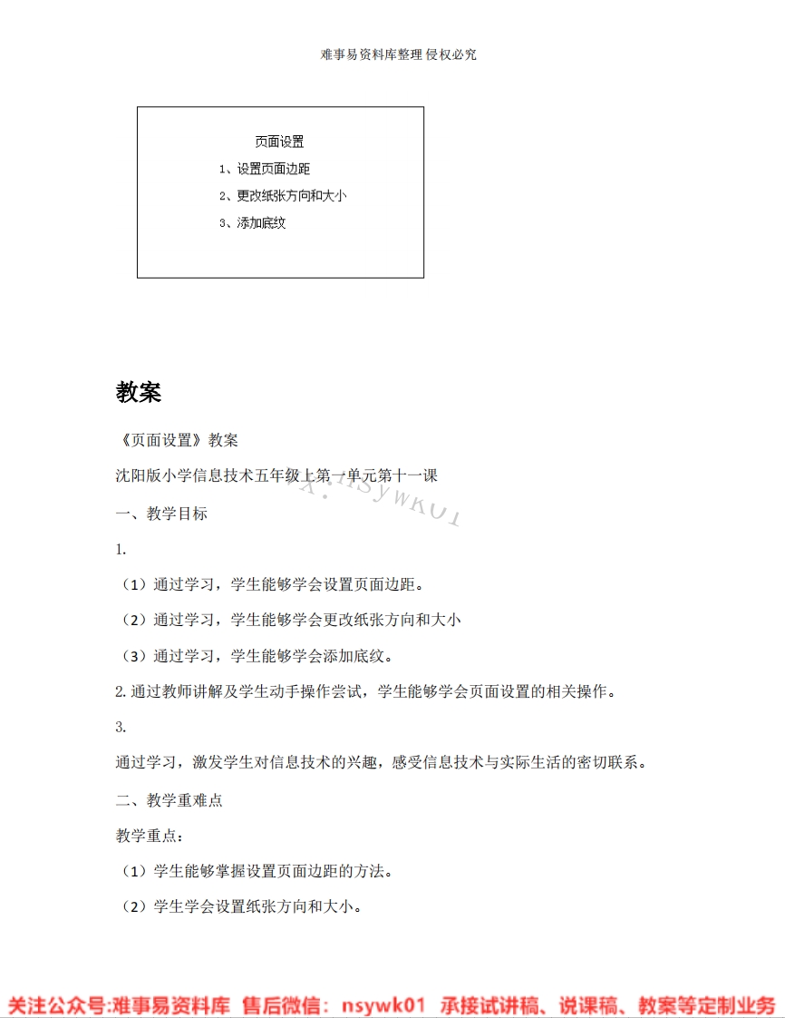 难事易资料库整理侵权必究页面设置1、设置页面边距2、更改纸张方向和大小3、添加底纹教案《页面设置》教案沈阳版小学信息技术五年级上第一单元第十一课一、教学目标1.(1)通过学习,学生能够学会设置页面边距。(2)通过学习,学生能够学会更改纸张方向和大小(3)通过学习,学生能够学会添加底纹。2.通过教师讲解及学生动手操作尝试,学生能够学会页面设置的相关操作。3.通过学习,激发学生对信息技术的兴趣,感受信息技术与实际生活的密切联系。二、教学重难点教学重点:(1)学生能够掌握设置页面边距的方法。(2)学生学会设置纸张方向和大小。关注公众号:难事易资料库售后微信:5ywk01承接试讲稿、说课稿、教案等定制业务难事易资料库整理侵权必究教学难点:学生能够熟练掌握添加底纹的方法。三、教学过程(一)导入问题导入:通过引入近期新型冠状病毒防疫战的话题,组织学生交流在抗战新冠病毒期间自己心中的民间英雄,引发学生思考。再次通过问题,询问学生是否想向英雄致敬,向他们寄送一封电子信件。从而引出本节课的课题,页面设置来完成信件的封面。(二)教授新课1.设置页面边距(1)通过询问学生一般信封的大小、形状等,引出制作信封要首先在设置页面边距。(2)教师演示讲解在页面布局中设置窄页面边距的步骤。(3)学生仿照步骤自行操作,掌握在页面布局中设置页面边距的相关操作。yWKU2.设置纸张方向和大小(1)教师了解学生设置窄页边距的原因,引导学生改变纸张大小和方向能够设置出信封的形状。(2)组织学生参考书中内容,找到演示更改纸张方向和大小的办法,教师巡视指导。(3)学生代表演示在页面布局中设置纸张方向和大小的操作。3.设置底纹(1)学生提出疑问,还有什么方法能够使文档与信封封面更加相似?教师提示可以通过添加底纹来完成。(2)组织学生小组讨论,合作探究。(3)选出学生代表详细演示添加底纹的操作步骤,操作重点是要在边框和底纹的对话框中找到底纹填充颜色。(三)练习关注公众号:难事易资料库售后微信:Sywk01承接试讲稿、说课稿、教案等定制业务