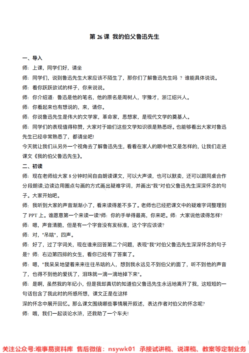 首页试讲逐字稿小学语文统编版-小学语文6年级上册《我的伯父鲁迅先生》试讲逐字稿