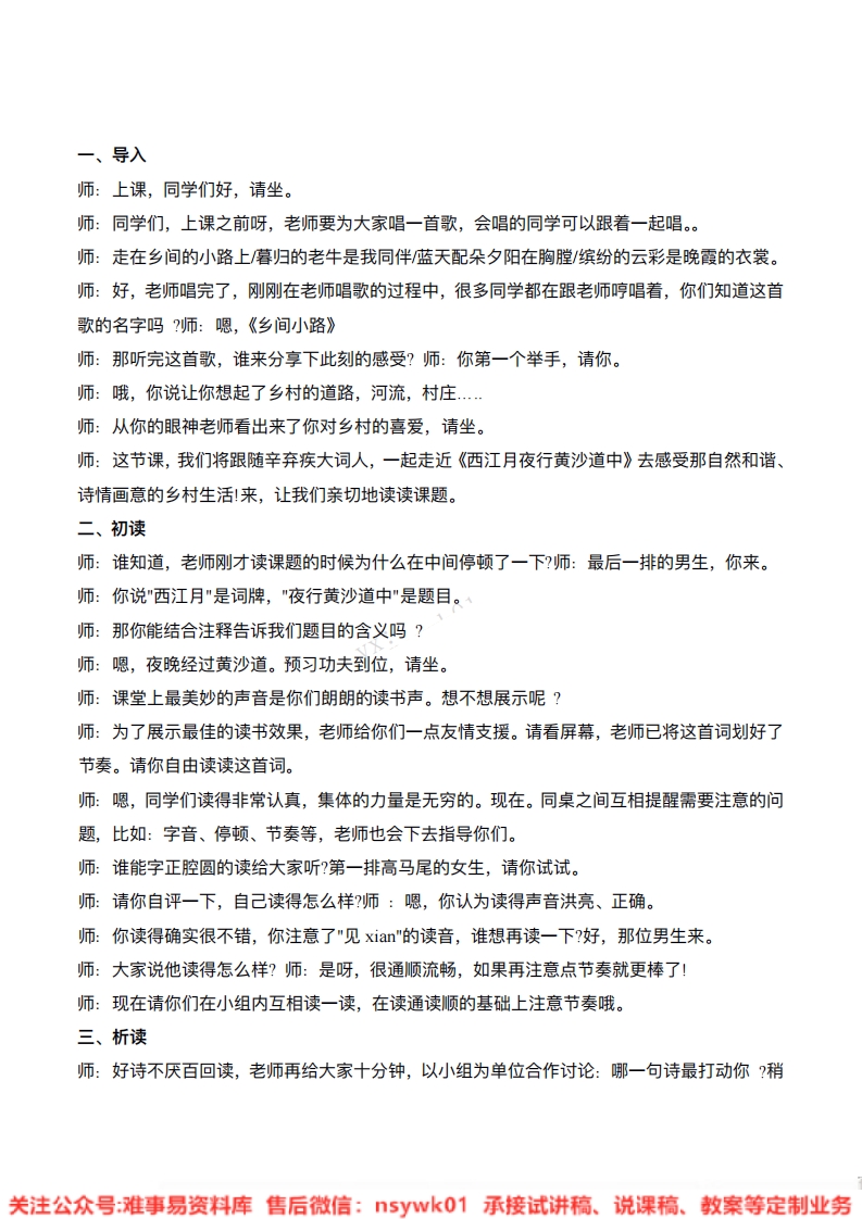 统编版-小学语文6年级上册《西江月·夜行黄力道中》试讲逐字稿