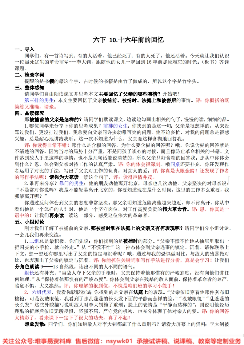 首页试讲逐字稿小学语文统编版-小学语文6年级下册《10.十六年前的回忆》试讲逐字稿