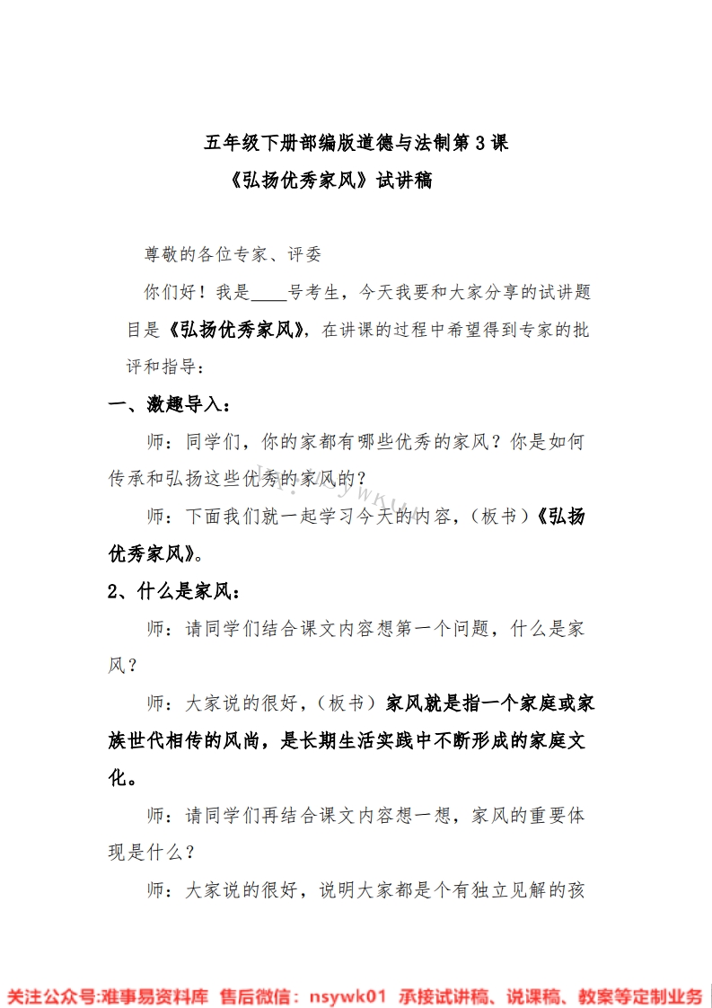 小学道德法制《五下弘扬优秀家风》试讲逐字稿【免费质量一般】.d84507c622f46eace1bd638a982e1a40