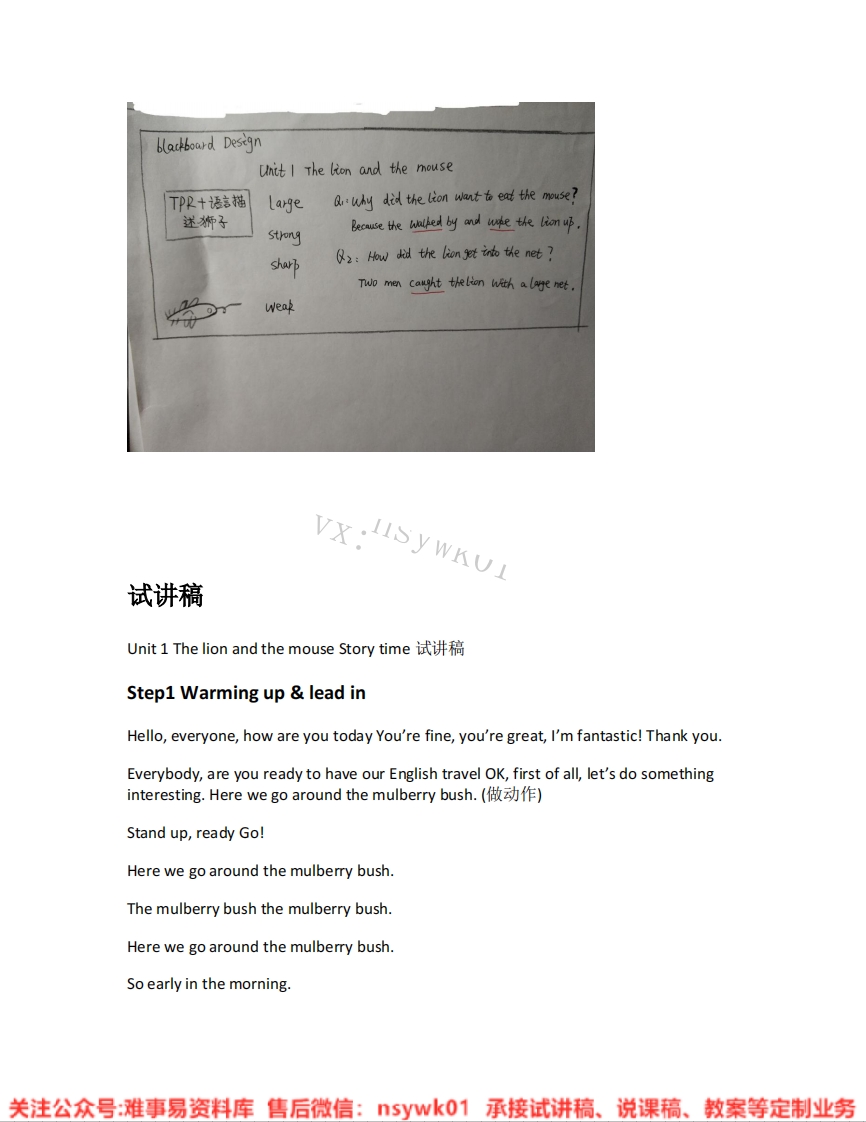 Unit I The lion and the mouse述狮子试讲稿Unit1 The lion and the mouse Story time试讲稿Step1 Warming up lead inHello,everyone,how are you today You're fine,you're great,I'm fantastic!Thank you.Everybody,are you ready to have our English travel OK,first of all,let's do somethinginteresting.Here we go around the mulberry bush.(做动作)Stand up,ready Go!Here we go around the mulberry bush.The mulberry bush the mulberry bush.Here we go around the mulberry bush.So early in the morning.关注公众号:难事易资料库售后微信:5ywk01承接试讲稿、说课稿、教案等定制业务(这首歌曲是边唱边做动作的,可根据考试时间选择唱几句)Wow,are you excited now Yes,me too.Guys,I'm pretty excited now,do you know whyBecause I just read a terrible tale!Do you know some tales that we have learnt beforeOh,I heard someone says Cinderella,Goldilocks and the three bears,the King's newclothes.(手点到方向,随机说出故事名字)You really remembered so many tales.Thisclass,we are going to learn another tale.Yes,you got it.It is Unit 1 The lion and themouse..(板书标题)Step2 pre-readingOK,everybody,I have a riddle for you.Please guess what animal it is.It's large andstrong.It has big sharp teeth.It can run fast.It's the king of the forest.What is it Wow,you are so clever,Jimmy..Yes,it is a lion.(边说边用动作表示,sharp可以指着自己的牙齿,夸张说)Now,please look at the lion on the PPT.You can see his large and strongbody.(板书并领读2遍)And his teeth are very sharp.(板书并领读2遍)Look here,boys and girls,do you know what it is(转身黑板上画出老鼠).OK,you are so smart.Bingo,it is a mouse.But compared with the lion,we can see the mouse is so small andweak,right(板书并领读2遍).Do you have any problems with these words OK,mydear kids,actually,these words and the lion and the mouse are all from today's lesson,do you want to know more about this lesson Well guys,before we learn the story,I havea question for you.Please guess will the lion and the mouse be good friend Oh,I heardsomeone says yes and someone says no.Step 3 While-readingNow,please watch the video of the story,then check whether the lion and the mousebe good friends or not.Let's go!(2)Class,the video is over,who can tell us theanswer Hands up.Oh,Jeffery,you are so active,please.(做出请的手势)Wel,Jefferysays the lion and the mouse are good friends.Do you agree with his answer Yes,me too.Let's give him big hands and please sit down.Guys,since you have got the maininformation of the tale,now please read the story by yourselves and then try to put thesentences in order.1.The lion caught the mouse.2.The mouse helped the lion get out3.The lion and the mouse became friends.4.The lion could not get out from the net.5..The lion let the mouse go.关注公众号:难事易资料库售后微信:5ywk01承接试讲稿、说课稿、教案等定制业务
