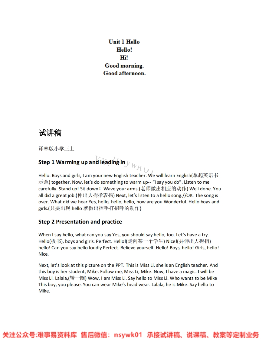 Unit 1 HelloHello!Hi!Good morning.Good afternoon.试讲稿译林版小学三上Step 1 Warming up and leading in y wHello.Boys and girls,,I am your new English teacher..We will learn English(拿起英语书示意)together..Now,let's do something to warm up-“I say you do”.Listen to mecarefully.Stand up!Sit down!Wave your arms..(老师做出相应的动作)Well done.Youall did a great job.(伸出大拇指表扬)Next,let's listen to a hello song./OK.The song isover.What did we hear Yes,hello,hello,hello,how are you Wonderful.Hello boys andgirls..(只要出现hello就做出挥手打招呼的动作)Step 2 Presentation and practiceWhen I say hello,what can you say Yes,you should say hello,too.Let's have a try.Hello(板书),boys and girls..Perfect.Hello!(走向某一个学生)Nice!(并伸出大拇指)hello!Can you say hello loudly Perfect.Believe yourself.Hello!Boys,hello!Girls,hello!Nice.Next,let's look at this picture on the PPT.This is Miss Li,she is an English teacher.Andthis boy is her student,Mike.Follow me,Miss Li,Mike.Now,I have a magic.I will beMiss Li.Lalala,(Wow,I am Miss Li.Say hello to Miss Li.Who wants to be MikeThis boy,you please.You can wear Mike's head wear.Lalala,he is Mike.Say hello toMike.关注公众号:难事易资料库售后微信:5ywk01承接试讲稿、说课稿、教案等定制业务You did a great job.Now,let's enjoy a "good momning"song.OK.The song is over.Canyou sing Let's sing together.Good morning.(Good morning,to you,to you and toyou.Beautiful!Let's enjoy a video on our book.Let's see what Mike says to his students.Here we go.Well.The video is over.Do you find the answer Yes,he said "Hi."how about his friendsThey also said hi().Nice,follow me.Hi.Hi,boys and girls.Here is another video.We will see what Miss Li says to her students.Here we go.Well.The video is over.Do you find the answer Yes,she said "Good aftemoon."how abouther students What did they say They said "Good afternoon,Miss Li."follow me.Goodafternoon.(板书)Let's open the book.Turn to page 6.Read the dialogue after the recording.Payattention to your pronunciation and intonation.Here we go!Wow,you read socarefully.I am proud of you.Now,let's act out the dialogue with the head wear.Whowants to be Mike Your hand is so high you please.Who wants to be Miss Li That girl inthe corner.We are all students.Are you ready Let's go!//OK.I love your performance.Step 3 ProductionAt last,let's sing a hello song.Hello,hello,hello,how are you Hello,hello,hello,how areyou A beautiful song.You sang so well.Let's have a PK,Boys and girls,are you ready Iwill see who sings better Girls first!/wow,you sang beautifully.Boys your turn!//Ican't hear you clearly.Can you speak louder next time This time,girls win.Boys come onplease.Don't be shy,just try.Do you want to have another PK Wow,all of you want to have a PK.This time I hearboys'sound is so high.Now,let's make a new song by ourselves just like "hello"song.OK 3 minutes for you.Here we go.OK.The time is over.Who wants to share your songThat boy,your hand is so high,you please."Hi,hi,how are you Hi,hi,how are you."Nice.Boys great!This time boys win.Step 4 SummarySo,would you please summarize what we have learned today The girl in red please.Yeah,great.Through this class,we have learned the dialogue and the key sentences:"Hi.Hello.Good morning.Good afternoon."Dear children,learning English is veryinteresting.We should learn it well and speak English as much as we can.Step 5 homeworkSo,here comes our homework.Teach your parents how to greet to others in English,then share it with others next class.关注公众号:难事易资料库售后微信:5ywk01承接试讲稿、说课稿、教案等定制业务