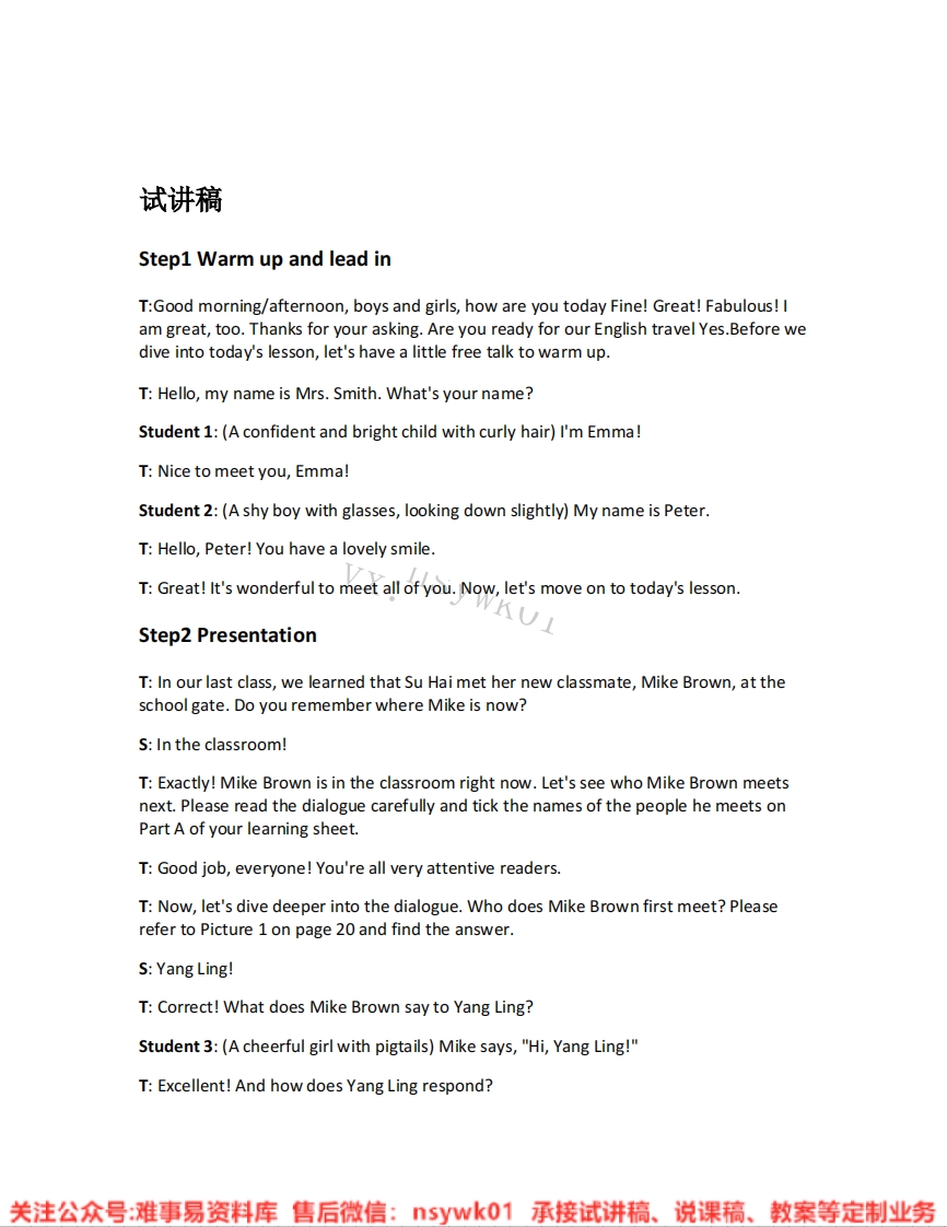 试讲稿Step1 Warm up and lead inT:Good morning/afternoon,boys and girls,how are you today Fine!Great!Fabulous!Iam great,too.Thanks for your asking.Are you ready for our English travel Yes.Before wedive into today's lesson,let's have a little free talk to warm up.T:Hello,my name is Mrs.Smith.What's your name?Student 1:(A confident and bright child with curly hair)I'm Emma!T:Nice to meet you,Emma!Student 2:(A shy boy with glasses,looking down slightly)My name is Peter.T:Hello,Peter!You have a lovely smileT:Great!It's wonderful to meet all of you.Now,let's move on to today's lesson.Step2 PresentationT:In our last class,we learned that Su Hai met her new classmate,Mike Brown,at theschool gate.Do you remember where Mike is now?S:In the classroom!T:Exactly!Mike Brown is in the classroom right now.Let's see who Mike Brown meetsnext.Please read the dialogue carefully and tick the names of the people he meets onPart A of your learning sheet.T:Good job,everyone!You're all very attentive readers.T:Now,let's dive deeper into the dialogue.Who does Mike Brown first meet?Pleaserefer to Picture 1 on page 20 and find the answer.s:Yang Ling!T:Correct!What does Mike Brown say to Yang Ling?Student 3:(A cheerful girl with pigtails)Mike says,"Hi,Yang Ling!"T:Excellent!And how does Yang Ling respond?关注公众号:难事易资料库售后微信:5ywk01承接试讲稿、说课稿、教案等定制业务Student s:(Collectively)"Hello,Mike!"T:Wonderful!Now,who else does Mike meet?Please turn to Picture 2 on page 20.Students:Liu Tao and Wang Bing!T:That's right!What do they say to Mike?Student 4:(A tall boy with a friendly smile)Liu Tao says,"Nice to meet you,Mike!"Student 5:(A girl with braces,smiling warmly)Wang Bing says,"Welcome to our class!"T:Superb!You're all doing great.T:So,Mike Brown meets three new classmates.How does he feel?Students:Confused!T:Why do you think he's confused?Students:(Collectively)Because he can't differentiate their names and appearances!T:Exactly!Would you like to help Mike remove his confusion?Students:Yes!Step3 PracticeT:Great!First,write down your own name on the learning sheet and try to find thedifferences between your name and Mike Brown's.T:Excellent observations!Next time,remember to pay attention to the order of familyname and first name,as well as the capitalization of the first letter.T:You now have a good understanding of the dialogue.Please read it again and find theanswer to the question-"How does Mike get to know other students'names?"Afterwards,complete Part C on your learning sheet.T:Excellent work!So,next time when you want to know someone's name,you can say,"Hello,I'm..."or "What's your name?"Step4 ProductionT:Now,let's pair up and practice the sentences in Part B on your learning sheet.Usethese sentences and the names we mentioned earlier to create a dialogue with yourpartner.Remember to speak correctly and loudly.关注公众号:难事易资料库售后微信:5ywk01承接试讲稿、说课稿、教案等定制业务