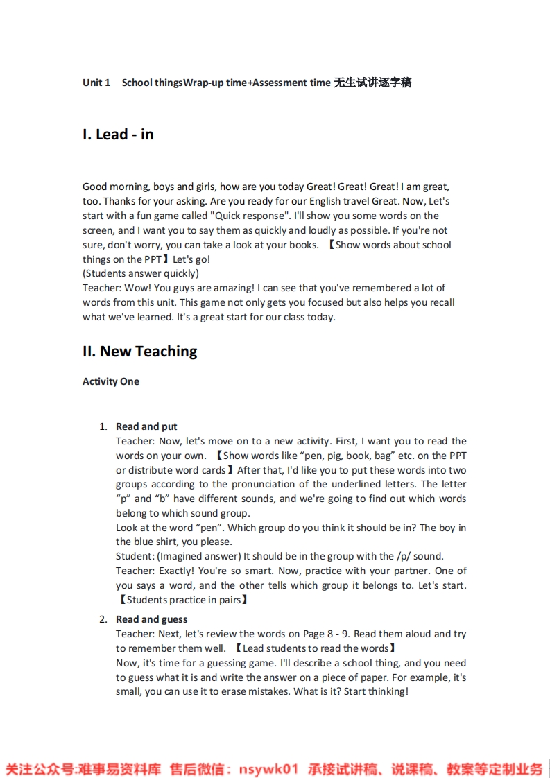Unit1 School thingsWrap-up time+Assessment time无生试讲逐字稿1.Lead inGood morning,boys and girls,how are you today Great!Great!Great!I am great,too.Thanks for your asking.Are you ready for our English travel Great.Now,Let'sstart with a fun game called "Quick response".I'll show you some words on thescreen,and I want you to say them as quickly and loudly as possible.If you're notsure,don't worry,you can take a look at your books.[Show words about schoolthings on the PPT】Let'sgo!(Students answer quickly)Teacher:Wow!You guys are amazing!I can see that you've remembered a lot ofwords from this unit.This game not only gets you focused but also helps you recallwhat we've learned.It's a great start for our class today.Il.New TeachingActivity One1.Read and putTeacher:Now,let's move on to a new activity.First,I want you to read thewords on your own.[Show words like "pen,pig,book,bag"etc.on the PPTor distribute word cards After that,I'd like you to put these words into twogroups according to the pronunciation of the underlined letters.The letter"p"and "b"have different sounds,and we're going to find out which wordsbelong to which sound group.Look at the word "pen".Which group do you think it should be in?The boy inthe blue shirt,you please.Student:(Imagined answer)It should be in the group with the /p/sound.Teacher:Exactly!You're so smart.Now,practice with your partner.One ofyou says a word,and the other tells which group it belongs to.Let's start.【Students practice in pairs】2.Read and guessTeacher:Next,let's review the words on Page 8-9.Read them aloud and tryto remember them well.[Lead students to read the words]Now,it's time for a guessing game.I'll describe a school thing,and you needto guess what it is and write the answer on a piece of paper.For example,it'ssmall,you can use it to erase mistakes.What is it?Start thinking!关注公众号:难事易资料库售后微信:5yk01承接试讲稿、说课稿、教案等定制业务(Students write down their answers)Teacher:Okay,time's up.Share your answers with your partner and readthem together.The girl with pigtails,can you share what you guessed withthe class?Student:(Imagined answer)I guessed it's a rubber.Teacher:Right!You're very good at this.This game helps you know moreabout the features of each school thing.3.Read and reciteTeacher:Let's read and recite the stories on Page 10 and Page 12-13.Try todo it by heart.[Students start reading and reciting]I'll come around and listen to you recite.The boy in the corner,you start.Student:(Imagined reciting)[Recites the story]Teacher:Well-done!Your recitation is very fluent.After reciting,we'll playan interesting game.游戏环节Teacher:Now,let's play a game.Look at the pictures on the screen.One of you takesa stationery item out of the schoolbag secretly,and the other one guesses what it is.Use the sentences we learned,like "What's this /that?""It's...""Is it...?""Yes,it is./No,it isn't."Then,you two can switch roles.Let's start!(Students play the game in pairs)Teacher:I see you're all having a great time.The pair at the front,can you show ushow you play?Student 1:(Imagined action)I take something out.Guess,what's this?Student 2:(Imagined answer)Is it a ruler?Student 1:(Imagined answer)No,it isn't.Student 2:(Imagined answer)Is it a pen?Student 1:(Imagined answer)Yes,it is.Teacher:Excellent!You used the sentences very well.Ill.ConsolidationActivity Two1.Look and circleTeacher:Open your books to Page 15.Look at Part A and circle the rightanswers.【Students circle the answers】.After that,follow the model and talk with your partner.The model is "Can Ihelp you ""Yes.I need..."The girl in the pink dress,can you start aconversation with your partner and share it with us?关注公众号:难事易资料库售后微信:5yk01承接试讲稿、说课稿、教案等定制业务