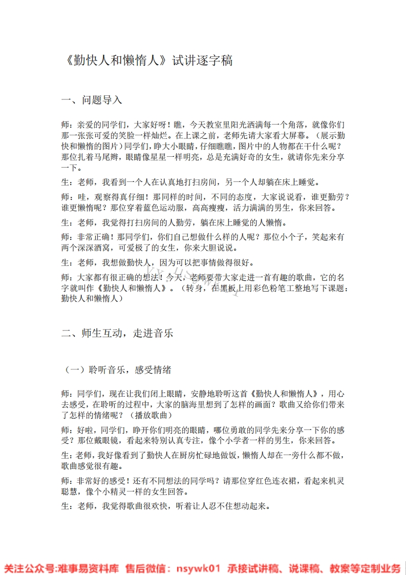 《勤快人和懒惰人》试讲逐字稿一、问题导入师:亲爱的同学们,大家好呀!瞧,今天教室里阳光洒满每一个角落,就像你们那一张张可爱的笑脸一样灿烂。在上课之前,老师先请大家看大屏幕。(展示勤快和懒惰的图片)同学们,睁大小眼睛,仔细瞧瞧,图片中的人物都在干什么呢?那位扎着马尾辫,眼睛像星星一样明亮,总是充满好奇的女生,就请你先来分享一下。生:老师,我看到一个人在认真地打扫房间,另一个人却躺在床上睡觉。师:哇,观察得真仔细!那同样的时间,不同的态度,大家说说看,谁更勤劳?谁更懒惰呢?那位穿着蓝色运动服,高高瘦瘦,活力满满的男生,你来回答。生:老师,我觉得打扫房间的人勤劳,躺在床上睡觉的人懒惰。师:非常正确!那同学们,你们自己想做什么样的人呢?那位小个子,笑起来有两个深深酒窝,可爱极了的女生,你来大胆说说。生:老师,我想做勤快人,因为可以把事情做得很好。师:大家都有很正确的想法!今天,老师要带大家走进一首有趣的歌曲,它的名字就叫作《勤快人和懒惰人》。(转身,在黑板上用彩色粉笔工整地写下课题:勤快人和懒惰人)二、师生互动,走进音乐(一)聆听音乐,感受情绪师:同学们,现在让我们闭上眼睛,安静地聆听这首《勤快人和懒惰人》,用心去感受,在聆听的过程中,大家的脑海里想到了怎样的画面?歌曲又给你们带来了怎样的情绪呢?(播放歌曲)师:好啦,同学们,睁开你们明亮的眼睛,哪位勇敢的同学先来分享一下你的感受?那位戴眼镜,看起来特别认真专注,像个小学者一样的男生,你来回答。生:老师,我好像看到了勤快人在厨房忙碌地做饭,懒惰人却在一旁什么都不做,歌曲感觉很有趣。师:非常好的感受!还有不同想法的同学吗?请那位穿红色连衣裙,看起来机灵聪慧,像个小精灵一样的女生回答。生:老师,我觉得歌曲很欢快,听着让人忍不住想动起来。关注公众号:难事易资料库售后微信:5yk01承接试讲稿、说课稿、教案等定制业务师:大家说得都很准确!《勤快人和懒惰人》这首歌曲,旋律活泼轻快,节奏感强,歌词简单明了。它通过对比勤快人和懒惰人在一天中的不同表现,传达出勤劳带来收获、懒惰导致无所事事的价值观。下面,跟着老师一起朗诵歌词,感受歌词里的有趣故事。(教师带领学生朗诵歌词)师:同学们朗诵得很有感情!现在,我们一边朗诵,一边加入一些有趣的声势动作,让我们的朗诵更加生动。(教师带领学生边朗诵边加入声势动作)(二)分析音乐,表现音乐师:同学们,这首歌曲旋律流畅,是由三个乐句组成的。现在,我们就跟着老师的钢琴,开始学唱啦。首先,我们来演唱第一乐句。大家跟着老师的琴声,仔细听,认真唱。(教师弹琴,学生跟琴演唱第一乐句)师:同学们学得真快,第一乐句唱得很不错!现在,我们把歌词填进去,试着完整地演唱这一乐句。(学生填词演唱第一乐句)师:非常棒!下面,请同学们跟着琴演唱第二乐句。(学生跟琴演唱第二乐句)师:好,填词演唱第二乐句。(学生填词演唱第二乐句)师:下面演唱第三乐句。(学生跟琴演唱第三乐句)师:很好,填词演唱第三乐句。(学生填词演唱第三乐句)师:同学们,现在我们已经学会了这三个乐句,下面我们把整首歌曲完整地演唱一遍,要唱出歌曲的活泼轻快,展现出勤快人和懒惰人的不同形象。(学生整体演唱)三、精彩演绎,自由发挥师:同学们,经过前面的学习,大家对这首《勤快人和懒惰人》已经掌握得很好了。现在,老师要邀请几位同学上台,用声势动作和舞蹈的方法,把这首歌曲表现得更加生动。谁先来勇敢地展示自己?那位勇敢地第一个举手,充满自信,像个小勇士一样的高个子男生,就请你上台。师:哇,你表演得太精彩了,歌声响亮,声势动作和舞蹈都特别有节奏感,把勤快人和懒惰人的特点都展现出来了!还有哪位同学想上台展示?请那位扎着丸子头,活力四射,像个小太阳一样的女生。师:太棒啦,你的表演充满了活力,和歌曲配合得严丝合缝,每一个动作都仿佛带着你的热情在跳跃,太出色了!五、课堂小结关注公众号:难事易资料库售后微信:5yk01承接试讲稿、说课稿、教案等定制业务