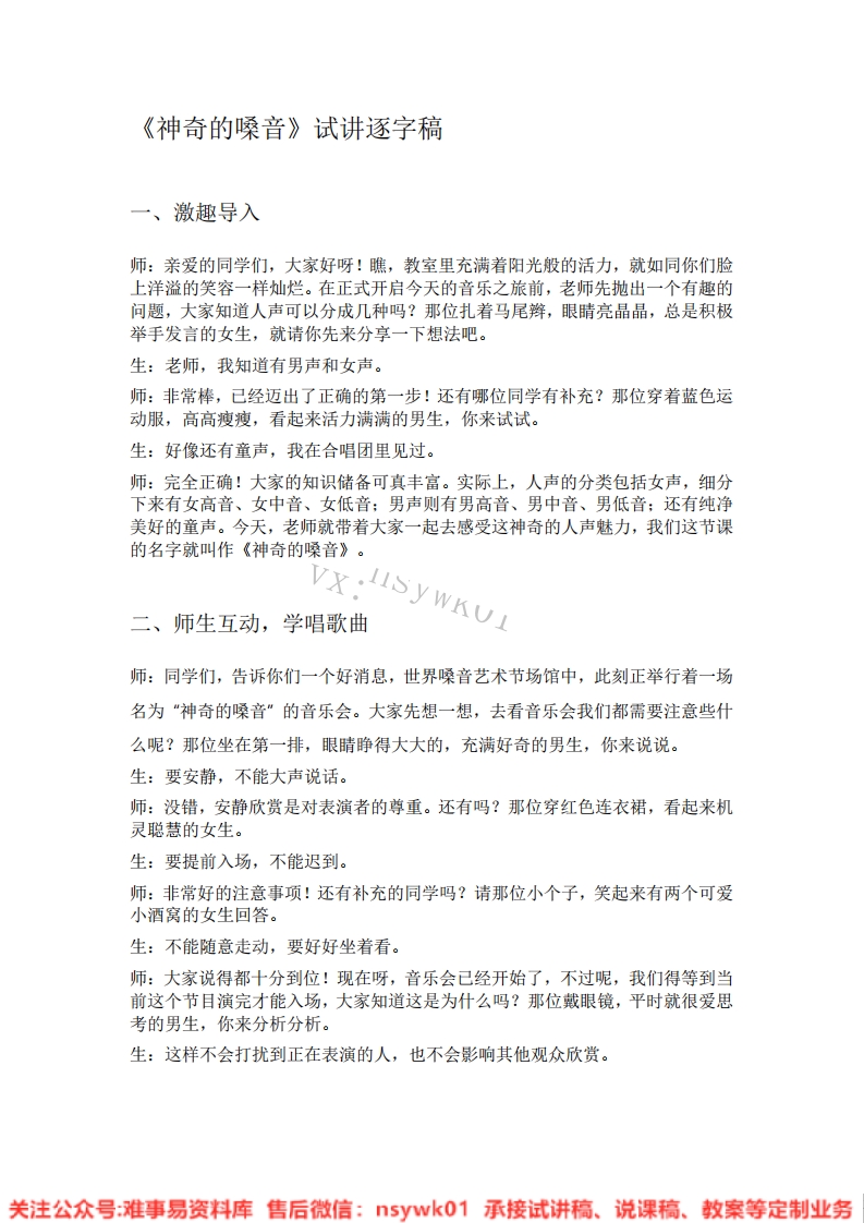 《神奇的嗓音》试讲逐字稿一、激趣导入师:亲爱的同学们,大家好呀!瞧,教室里充满着阳光般的活力,就如同你们脸上洋溢的笑容一样灿烂。在正式开启今天的音乐之旅前,老师先抛出一个有趣的问题,大家知道人声可以分成几种吗?那位扎着马尾辫,眼睛亮晶晶,总是积极举手发言的女生,就请你先来分享一下想法吧。生:老师,我知道有男声和女声。师:非常棒,已经迈出了正确的第一步!还有哪位同学有补充?那位穿着蓝色运动服,高高瘦瘦,看起来活力满满的男生,你来试试。生:好像还有童声,我在合唱团里见过。师:完全正确!大家的知识储备可真丰富。实际上,人声的分类包括女声,细分下来有女高音、女中音、女低音:男声则有男高音、男中音、男低音:还有纯净美好的童声。今天,老师就带着大家一起去感受这神奇的人声魅力,我们这节课的名字就叫作《神奇的嗓音》。二、师生互动,学唱歌曲师:同学们,告诉你们一个好消息,世界嗓音艺术节场馆中,此刻正举行着一场名为“神奇的嗓音”的音乐会。大家先想一想,去看音乐会我们都需要注意些什么呢?那位坐在第一排,眼睛睁得大大的,充满好奇的男生,你来说说。生:要安静,不能大声说话。师:没错,安静欣赏是对表演者的尊重。还有吗?那位穿红色连衣裙,看起来机灵聪慧的女生。生:要提前入场,不能迟到。师:非常好的注意事项!还有补充的同学吗?请那位小个子,笑起来有两个可爱小酒窝的女生回答。生:不能随意走动,要好好坐着看。师:大家说得都十分到位!现在呀,音乐会已经开始了,不过呢,我们得等到当前这个节目演完才能入场,大家知道这是为什么吗?那位戴眼镜,平时就很爱思考的男生,你来分析分析。生:这样不会打扰到正在表演的人,也不会影响其他观众欣赏。关注公众号:难事易资料库售后微信:5yk01承接试讲稿、说课稿、教案等定制业务师:你说得太对了,考虑得很周全!现在,让我们来看看今天音乐会的节目单上都有哪些精彩节目要上演吧。(展示节目单)那位坐在窗边,一直专注听讲的女生,你来给大家说说你看到了什么节目。生:有独唱,还有合唱。师:观察得很仔细!那在这份节目单里,大家发现了什么秘密呢?那位穿条纹衬衫,思维活跃的男生,你来分享一下。生:我发现有女生演唱的,有男生演唱的,还有童声演唱的。师:太棒了,一下就抓住了关键!节目单上有女生、童声和男生演唱曲目,这其实就体现了人声的分类。那大家说说,人声一共分为几类呀?那位总是积极踊跃发言的小个子同学,你来回答。生:三类,女声、男声和童声。师:完全正确!其中女声又分为女高音、女中音、女低音,男声分为男高音、男中音、男低音,童声是不分这些的。现在,让我们正式开始欣赏节目吧!首先,我们一起来聆听花腔女高音独唱《春天的芭蕾》。大家闭上眼晴,用心去感受这美妙的声音。师:哇,这花腔女高音的声音是不是特别灵动,就像春天里翩翩起舞的小精灵?接下来,我们欣赏男高音独唱《啊,多么快乐的一天》。师:男高音的声音充满了力量,有没有让你们感受到那种喜悦和振奋呢?下面,欣赏童声合唱《回声》。师:童声合唱的声音清脆纯净,仿佛真的能听到山谷中的回声。那在这场音乐会中,哪一个节目给你们的印象最为深刻呢?那位穿黄色衣服,平时就对音乐很有感触的女生,你来谈谈。生:(思考片刻)我觉得童声合唱《回声》特别好听,声音很干净,让人感觉很温暖。师:还有不同感受的同学吗?那位高高壮壮,平时大大咧咧但此刻一脸认真的男生。生:我喜欢男高音独唱,感觉特别有气势,唱得我都激动起来了。三、精彩演绎,自由发挥师:同学们,刚才欣赏了这么多精彩的演唱,想必大家也跃跃欲试了。现在,老师要邀请几位同学上台,为我们展示一下自己的美妙歌喉,唱一首自己喜欢的歌曲。谁先来勇敢地迈出这一步?那位勇敢地第一个举手,充满自信的高个子男生,就请你上台。师:哇,你唱得太棒了,声音充满了感染力,让我们感受到了你对音乐的热爱!还有哪位同学想上台展示?请那位扎着丸子头,活力四射的女生。师:你的歌声宛如夜莺啼鸣,太动听了,而且舞台表现也十分出色!关注公众号:难事易资料库售后微信:5yk01承接试讲稿、说课稿、教案等定制业务