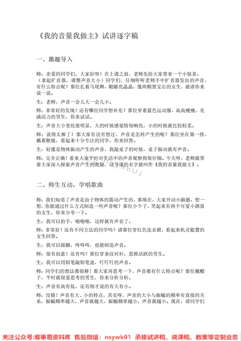 《我的音量我做主》试讲逐字稿一、激趣导入师:亲爱的同学们,大家好呀!在上课之前,老师先给大家带来一个小惊喜。(拿起扩音器,调整声音大小)同学们,仔细听听老师手中扩音器发出的声音,有什么特点呢?那位扎着马尾辫,眼睛亮晶晶,像两颗黑宝石的女生,就请你来说一说。生:老师,声音一会儿大一会儿小。师:非常好的发现!还有哪位同学想补充?那位穿着蓝色运动服,高高瘦瘦,充满活力的男生,你来试试。生:声音大小变化很明显,大的时候感觉特别响亮,小的时候就比较轻柔。师:说得太棒了!那大家有没有想过,声音是怎样产生的呢?那位坐在第一排,戴着眼镜,看起来十分专注的同学,你来回答。生:好像是物体振动产生的声音,我敲桌子的时候,桌子振动就有声音。师:完全正确!看来大家平时对生活中的声音观察得很仔细。今天呀,老师就带着大家深入探索声音产生的奥秘,这节课的名字就叫作《我的音量我做主》。二、师生互动,学唱歌曲师:我们知道了声音是由于物体的震动产生的,那现在,大家开动小脑筋,想一想,你能通过什么方式制造一些声音呢?那位小个子,笑起来有两个可爱小酒窝的女生,你来分享一下。生:我可以拍手,啪啪啪,这样就有声音了。师:非常好!还有不同方法的同学吗?请那位穿红色连衣裙,看起来机灵聪慧的女生回答。生:我可以跺脚,咚咚咚,也能制造声音。师:很有创意!还有吗?那位穿条纹衬衫,思维活跃的男生。生:我可以用铅笔敲铅笔盒,叮叮叮的声音。师:同学们的想法都很棒!那大家再思考一下,声音都有什么特点呢?那位戴帽子,平时就很爱思考的男生,你来分析分析。生:声音有高有低,还有刚才说的有大有小。师:没错!声音有大、小的特点,其实呀,声音的大小与振幅的频率有直接的关系,振幅频率越大,声音就越大,振幅频率越小,声音就越小。现在,请同学们关注公众号:难事易资料库售后微信:5yk01承接试讲稿、说课稿、教案等定制业务以小组为单位,讨论一下,并且找找身边的物体或乐器,来模拟声音的大小。(学生们开始小组讨论并操作,教师巡视各小组,给予指导)师:好啦,时间到!哪个小组先来展示一下你们模拟声音大小的成果?有请第一小组的代表,那位穿着蓝色牛仔裤,性格开朗的男生。生:老师,我们用尺子压在桌子边缘,拨动尺子,尺子振动幅度大的时候,声音就大:振动幅度小的时候,声音就小。师:非常好,通过实验直观地展示了声音大小和振幅的关系!还有哪个小组想展示?第三小组的代表,那位戴粉色发卡,文静甜美的女生。生:我们用小鼓来模拟,用力敲鼓面,鼓面振幅大,声音就大:轻轻敲,鼓面振幅小,声音就小。师:太棒了!下面,老师要请几位同学上台,更直观地为大家展示一下声音的大小。那位勇敢地第一个举手,充满自信的高个子男生,就请你上台。师:哇,你展示得非常清晰,让大家更清楚地看到了声音大小的变化。还有哪位同学想上台?请那位扎着丸子头,活力四射的女生。师:你的表现也十分出色!那大家想一想,声音的大小能不能控制呢?那位坐在窗边,一直专注听讲的女生,你来回答。生:可以控制,就像刚才我们用不同力度敲鼓,就能控制声音大小。师:完全正确!我们只要控制住声音的振幅频率即可控制声音的大小。现在,我们进入有趣的游戏环节。每两人一组,进行比拼,选出声音最小的一名同学,进入第二环节。大家迅速找到自己的搭档,开始吧!师:好啦,第一环节结束,成功进入第二环节的同学,每两人一组再进行比拼,这次要选出声音最大的进入第三个环节。大家加油哦!师:太棒了,成功进入第三环节的同学,每六人一组再进行低声传话,看哪一组速度最快,即可成为冠军。大家准备好,开始!三、精彩演绎,自由发挥师:同学们,刚才在游戏中大家对声音大小的控制已经很熟练了。现在,老师为大家准备了各种各样的道具和乐器,大家可以利用它们上台来表现声音的大小,充分发挥你们的想象力和创新能力,让我们的表演更加精彩!谁先来?那位勇敢地第一个举手,充满自信的高个子男生,就请你上台。师:哇,你用道具和乐器把声音大小的变化表现得淋漓尽致,太有创意了!还有哪位同学想上台展示?请那位扎着丸子头,活力四射的女生。师:太棒了,你的表演让我们仿佛置身于一个充满奇妙声音的世界,每一个声音大小的变化都那么恰到好处,太出色了!关注公众号:难事易资料库售后微信:5yk01承接试讲稿、说课稿、教案等定制业务