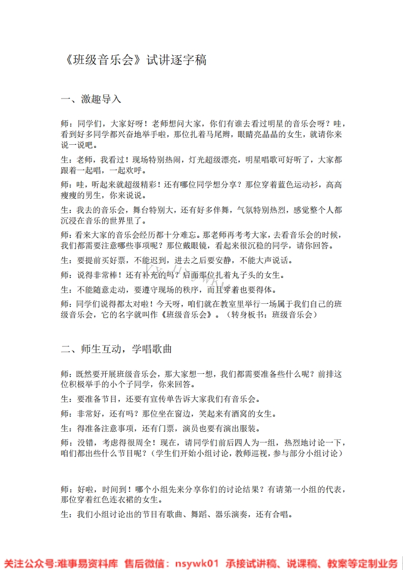《班级音乐会》试讲逐字稿一、激趣导入师:同学们,大家好呀!老师想问大家,你们有谁去看过明星的音乐会呀?哇,看到好多同学都兴奋地举手啦,那位扎着马尾辫,眼睛亮晶晶的女生,就请你来说一说吧。生:老师,我看过!现场特别热闹,灯光超级漂亮,明星唱歌可好听了,大家都跟着一起唱,一起欢呼。师:哇,听起来就超级精彩!还有哪位同学想分享?那位穿着蓝色运动衫,高高瘦瘦的男生,你来说说。生:我去的音乐会,舞台特别大,还有好多伴舞,气氛特别热烈,感觉整个人都沉浸在音乐的世界里了。师:看来大家的音乐会经历都十分难忘。那老师再考考大家,去看音乐会的时候,我们都需要注意哪些事项呢?那位戴眼镜,看起来很沉稳的同学,请你回答。生:要提前买好票,不能迟到,进去之后要安静,不能大声说话。师:说得非常棒!还有补充的吗?后面那位扎着丸子头的女生。生:不能随意走动,要遵守现场的秩序,而且穿着也要得体。师:同学们说得都太对啦!今天呀,咱们就在教室里举行一场属于我们自己的班级音乐会,它的名字就叫作《班级音乐会》。(转身板书:班级音乐会)二、师生互动,学唱歌曲师:既然要开展班级音乐会,那大家想一想,我们都需要准备些什么呢?前排这位积极举手的小个子同学,你来回答。生:要准备节目,还要有宣传单告诉大家我们有音乐会。师:非常好,还有吗?那位坐在窗边,笑起来有酒窝的女生。生:得准备注意事项,还有门票,演员也要有演出服装。师:没错,考虑得很周全!现在,请同学们前后四人为一组,热烈地讨论一下,咱们都出些什么节目呢?(学生们开始小组讨论,教师巡视,参与部分小组讨论)师:好啦,时间到!哪个小组先来分享你们的讨论结果?有请第一小组的代表,那位穿着红色连衣裙的女生。生:我们小组讨论出的节目有歌曲、舞蹈、器乐演奏,还有合唱。关注公众号:难事易资料库售后微信:5yk01承接试讲稿、说课稿、教案等定制业务师:哇,种类丰富多样呀!那接下来,我们一起讨论一下参加音乐会的注意事项。大家开动小脑筋,积极发言哦!请那位穿条纹衬衫的男生先说。生:穿着要得体,不能穿得太随便。师:很对!还有呢?中间那位短发的女生。生:要购票才能进入,而且在音乐会过程中不能大声喧哗,要保持安静。师:非常好!还有补充吗?角落里那位胖胖的男生。生:中途不能随意走动,节目中间也不能随意进入。师:同学们总结得太全面了!现在,老师来组织大家简单装扮一下演员,为音乐会做准备啦!(教师帮助学生进行简单装扮)师:好啦,一切准备就绪!下面,让我们欣赏第一个节目一歌曲独唱。有请我们的小歌唱家闪亮登场!(做出邀请的手势)师:哇,唱得太棒了,歌声婉转动听,仿佛把我们带入了一个美妙的音乐世界!接下来,欣赏第二个节目一舞蹈。看,我们的小舞者已经迫不及待了!师:太精彩了!这灵动的舞姿,就像翩翩起舞的蝴蝶,充满了活力!下面,有请欣赏第三个节目一器乐演奏。师:真厉害呀!这精湛的演奏技巧,让我们感受到了乐器独特的魅力。最后,是我们的合唱节目,大家一起期待!师:合唱的声音整齐又洪亮,唱出了团结的力量!音乐会到这里就结束了,大家要注意有序离场哦。三、精彩演绎,自由发挥师:同学们,刚才的节目是不是让大家意犹未尽?现在,我们利用手中的道具和乐器,上台为节目伴奏,发挥你们的创造力和想象力,让音乐更加丰富多彩!谁先来?那位勇敢举手的高个子男生,就请你上台。师:哇,配合得太默契了,让节目又增添了别样的风采!还有哪位同学想上台展示?请那位扎着双马尾的女生。师:太棒了,你的加入让音乐变得更加生动有趣!四、课堂小结关注公众号:难事易资料库售后微信:5yk01承接试讲稿、说课稿、教案等定制业务