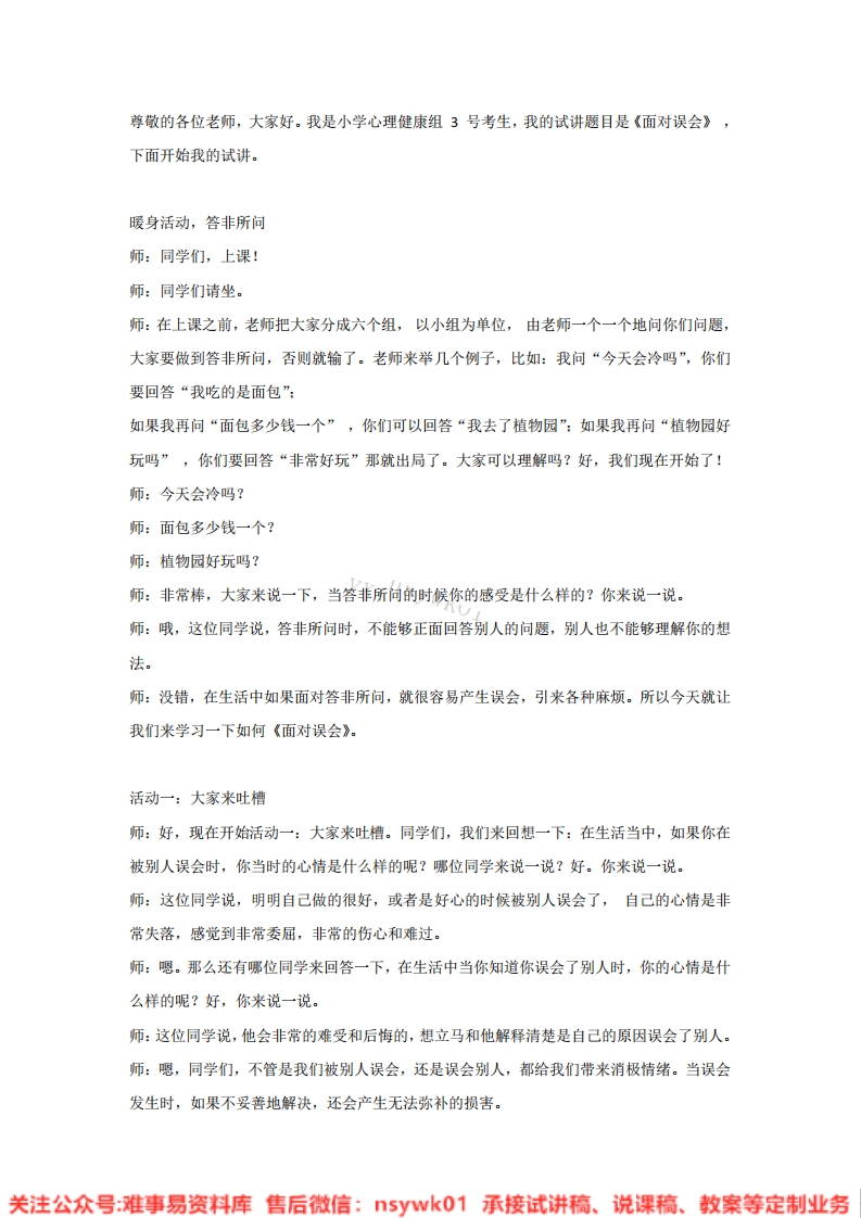 尊敬的各位老师,大家好。我是小学心理健康组3号考生,我的试讲题目是《面对误会》,下面开始我的试讲。暖身活动,答非所问师:同学们,上课!师:同学们请坐。师:在上课之前,老师把大家分成六个组,以小组为单位,由老师一个一个地问你们问题,大家要做到答非所问,否则就输了。老师来举几个例子,比如:我问“今天会冷吗”,你们要回答“我吃的是面包”:如果我再问“面包多少钱一个”,你们可以回答“我去了植物园”:如果我再问“植物园好玩吗”,你们要回答“非常好玩”那就出局了。大家可以理解吗?好,我们现在开始了!师:今天会冷吗?师:面包多少钱一个?师:植物园好玩吗?师:非常棒,大家来说一下,当答非所问的时候你的感受是什么样的?你来说一说。师:哦,这位同学说,答非所问时,不能够正面回答别人的问题,别人也不能够理解你的想法。师:没错,在生活中如果面对答非所问,就很容易产生误会,引来各种麻烦。所以今天就让我们来学习一下如何《面对误会》。活动一:大家来吐槽师:好,现在开始活动一:大家来吐槽。同学们,我们来回想一下:在生活当中,如果你在被别人误会时,你当时的心情是什么样的呢?哪位同学来说一说?好。你来说一说。师:这位同学说,明明自己做的很好,或者是好心的时候被别人误会了,自己的心情是非常失落,感觉到非常委屈,非常的伤心和难过。师:嗯。那么还有哪位同学来回答一下,在生活中当你知道你误会了别人时,你的心情是什么样的呢?好,你来说一说。师:这位同学说,他会非常的难受和后悔的,想立马和他解释清楚是自己的原因误会了别人。师:嗯,同学们,不管是我们被别人误会,还是误会别人,都给我们带来消极情绪。当误会发生时,如果不妥善地解决,还会产生无法弥补的损害。关注公众号:难事易资料库售后微信:5yk01承接试讲稿、说课稿、教案等定制业务师:下面我们来看一下大屏幕上所展示的这两个案例,一起来为这两位同学出谋划策吧。活动二:出谋划策师:好,我们先来看一下案例一:小鑫和表妹在家里玩耍,突然之间调皮的表妹一不小心把手划伤了,打碎了酒瓶。妈妈回来刚好看见这一幕。妈妈立马训斥了小鑫,并且打了小鑫一个巴掌,小鑫心里非常难过…案例二:小A和小B他们是一对好朋友,有一天小A的笔丢失了,刚好小B也拥有了一直一模一样的笔,小A怀疑是小B偷了他的笔,他们吵了起来。小B听了之后非常地伤心、难过…师:好,下面我们以小组为单位讨论一下:如果你是小鑫,你将如何去化解这个误会?如果你是小B,你将如何去化解这个误会呢?现在开始讨论吧!师:老师听到同学们讨论的声音渐渐变小了,现在老师要请两名同学来回答一下。好,你来说吧,师:这位同学说,如果他是小鑫的话,不能够将自己的委屈藏在心里,应该找妈妈把事情说清楚,妹妹是太过调皮了,她的手是她自己不小心划伤的,不是自己弄破的。同时,他也很理解妈妈非常着急的心理,但是被妈妈误会了,他还是非常伤心的。待妈妈知道事情经过后,他会向妈妈保证以后一定会看好妹妹。师:请坐,你回答得很不错。还有哪位同学来回答一下第二个问题?你来说一说吧!师:这位同学说,如果他是小B,他应该保持头脑冷静,并且换位思考去理解小A的想法,同时主动找到小A向他解释清楚这支笔是自己的,不是他弄丢的那支,消除小A对自己的误会,并且和小A一起寻找他丢失的那支笔。师:同学们说得都非常好,给案例中同学们的出谋划策都是非常细致的,很到位。相信通过大家的出谋划策,案例中的两名同学能够消除误会。师:好,通过以上各组同学给我们的分享,我们可以总结出:面对误会时,我们要保持头脑冷静,不生气,并且要学会“换位思考、真诚沟通”的方式面对误会,用宽容去化解误会。被别人误会时要冷静情绪,误会别人时要学会主动沟通。总结升华师:同学们,在我们生活中经常发生误会,当误会发生时,只有采取正确的处理方法,才能够化解误会。当你被别人误会时,你可以给误会你的人写封信,说明情况吗?当你误会别人关注公众号:难事易资料库售后微信:5yk01承接试讲稿、说课稿、教案等定制业务