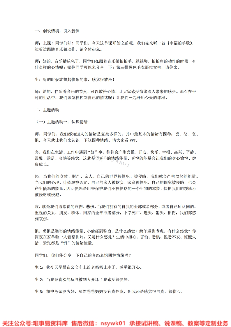 一、创设情境,引入新课师:上课!同学们好!同学们,今天这节课开始之前呢,我们先来听一首《幸福拍手歌》,边听边跟随音乐做动作,请全体起立。师:好的,音乐播放完了,同学们在跟着音乐做拍拍手,跺跺脚,拍拍肩的动作的时候,有什么样的心情呢?哪位同学可以来分享一下?第三排黑色毛衣那位女生,请你来。生:听的时候就想起快乐的事,感觉很放松!师:是的,伴随着音乐的节奏,可以放松心情,让大家感受情绪给人带来的感受。那么在平时的生活中,我们该怎样控制自己的情绪呢?让我们一起开始今天的课程。二、主题活动(一)主题活动一:认识情绪师:同学们,我们都知道人的情绪是复杂多样的,其中最基本的情绪有四种:喜、怒、哀、惧。今天就让我们来认识一下这四种情绪。请大家看PPT。喜,我们在生活、工作中遇到“好”事,往往会产生喜悦、开心、快乐、幸福、高兴、平静、温馨、满足、爽快等感觉,这就是“喜”的情绪能量。喜悦的能量会让我们的身心愉悦、健康成长。怒,当我们的身体、财产、亲人、自己的世界被侵犯、被侵略,我们就会产生愤怒的能量。当我们的心理、价值观被否定,自己的家人被欺负、家庭被侵犯,自己的国家被侵略,也会产生愤怒的能量。因此愤怒是用来保护我们不被侵略的一个生物的本能,保护我们的领地不被侵略或侵犯。哀,就是我们通常说的哀伤、悲伤。当我们拥有的自我的全部或者部分,或者自己所认同的、重视的关系、朋友、群体、国家的全部或者部分,不幸死亡、遗失、消失、损伤,我们都感到哀伤。惧,恐惧是避害的情绪能量。小偷碰到警察,是什么感觉?绵羊遇到老虎,有什么感觉?你深夜在家单独一人看恐怖片,又是什么感觉?生活中担心、害怕、恐惧、惶恐不安、惊慌失措、紧张都是“惧”的情绪能量。同学们,你们能分享一下自己的喜怒哀惧四种情绪吗?生1:我今天早晨在公交车上给老奶奶让座了,感觉很开心。生2:当我最喜欢的玩具被别人弄坏了我感觉很愤怒。生3:期中考试没考好,虽然爸爸妈妈没有责怪我,但我还是感觉很自责,很伤心。关注公众号:难事易资料库售后微信:5yk01承接试讲稿、说课稿、教案等定制业务生4:有一次爸爸妈妈都出差了,只有我一个人在家,大晚上可害怕了。师:谢谢四位同学的分享,人人都有情绪,每一种情绪都有其存在的合理性。(二)主题活动二:情绪传递师:接下来,我们一起玩一个情绪传递的游戏,请大家分成4组,每组同学由前往后列队站好。接下来听老师介绍游戏规则:(1)每组最后一名同学分别从情绪卡片堆里抽取卡片。(2)每位同学只能用肢体语言或表情传递纸上内容,全班同学不得发出声音。(3)只有被后面同学触摸肩膀时才能回头。(4)由站在最前方的同学说出卡片上的情绪:当猜错时,依次说出自己想表达的情绪是什么:当猜对时,全组同学面对大家,同时做出相同表情,并拍照留影。明白了吗?好,现在请大家排队站好,最后一名同学可以去抽取情绪卡片了。师:1组同学的情绪卡片是什么?生:喜。师:猜对了吗?1组:对了。师:好的,请1组同学集体做这个表情,我们来拍照留影。师:2组同学,你们的情绪卡片是什么呢?生:惧。师:对吗?生:不对,是“哀”。师:有点小遗憾,那请各位一次说说你们为什么理解成这种情绪吧…师:通过刚才的传递游戏,同学们对各种情绪又加深了了解。那我们怎么样表达自己的情绪呢?(三)主题活动三:表达情绪关注公众号:难事易资料库售后微信:5yk01承接试讲稿、说课稿、教案等定制业务