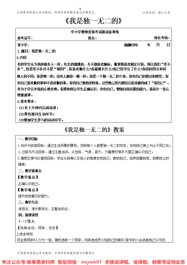9全国敬师资格证考试数材:考神资料苑藏资面试学霸笔记内部资料,禁止外传《我是独一无二的》中小学教师资格考试面试备课纸姓名:所在考场:某小学:抽时间:年月日1.题目:我是独无二的有的学生认为我和限多人一样,吃东西都跳食,冬天都喜欢赖床,做事情喜欢定计划,以我们“差不多”,但是差不多并不是“相同”,你喜欢做什么?你最拉长什么?你已经学会了什么?你的回答会和哄他人的不同。你是唯一的,没有人跟你一模一样。你是一个独无二的个体,你有自己的想法和感受,你有自己喜欢做的事和不喜欢做的事,你有自己独特的性格。这些独立的防面踪合起来就构城了“你自己”。作为小学五年级的心理老师,你要如向让学生正确认识、评价自已,赠强自我发展的能动,请设计一堂心理健康课。3.基本要求:(1)在十分钟内完诚试讲;(2)要有提问互动环节;(3)增加学生参与的活动环节。《我是独一无二的》教案1.知识与技能目标:通过生活场景的展现,找到每个人都是独一无二的存在,发现自己身上与众不同之处;2.过程与方法目标:通过主题活动,从性格、气质、能力,兴趣爱好等多方面正确认识自己;3.情感态度与价值观目标:学会从自身以及他人的角度发现自己,接纳自己,培养自尊自信,自爱自立的精神。【教学重点】正确认识自己。【教学难点】提升自我意识的能动。三、教学方法讲授法、演示教学法、主题活动法。四、新课讲授【热身活动:同学,你好】上讲述规则将全班同学8人分为一组,随机选取一个同学,向其他成员介绍自己的昵称家中的小名或者自己认可的关注公众号:难事易资料库售后微信:5ywk01承接试讲稿、说课稿、教案等定制业务99全国教师资格证考试裁材:考神资料苑藏资面试学霸笔记内部资料,禁止外传外号)和爱好,以顺时针的方向依次轮流介绍,例如第一个成员说:我是**喜欢*(例如“我是慢慢,喜欢收集杯子”),第二名成员说:我是**右面的**喜欢**(例如“我是坐在喜欢收集杯子的慢慢的右边的小辣椒,我喜欢看书”》,第三名学员说:我是**右面的**的右面的*喜欢**(例如“我是坐在喜欢收集杯子的慢慢的右边的喜欢看书的小辣椒的右边的小哪,我喜欢捏气泡”),最后一个同学要将所有人的昵称和爱好全部复述一遍。2.完成游戏按照顺序依次进行。3.分享感受(1)你的昵称有何内通?怎么获得这个昵称?(2)你的爱好如何确定?为什么喜欢做这件事?4.提出主题通过各位同学的相互介绍,我们发现每个人的成长经历都不同,每个人的性格爱好也有很大差异,因为我们都是独一无二的自己。(二)新课教学【主题活动上:猜猜“我”是谁】1.讲述规则刚刚我们向同伴介绍了自己,那么我的所作所为给别人留下了什么印象,别人是怎样看我的呢?以小组为单位,每组通过讨论推选一名同学,模仿班级内另一名同学的语言,行为动作,姿态等,其他同学猜一猜他模仿的是谁?如果需要配合,也可以小组内的同学共同来演一演,同学们清中后,让表演的同学说一说“为什么要这样模仿**?你眼中的**是一个什么样的人?”2.完成活动3.交流讨论(1)为什么要这样模仿**?你眼中的**是一个什么样的人?(2)**同学,你认为他说得有道理吗?谈谈你的看法?4.教师小结通过小伙伴之口,大家对于自己的了解又更深了一步,我们不仅要发现自己,更要学会悦纳自己。【主题活动二:小小漂流瓶】1.讲述规则结合刚刚同学们的表演,同桌之间互相讨论,针对“新”的自己,打算怎样做?把讨论的结果,写下来,放进漂流瓶。2.完成活动3.交流讨论师:大家讨论出来了什么样的结果?生1:保持自己的优势,改进自己的缺点。生2:直面自己的不足。全国敬师资格证考试教材:考神资料苑益资面试学霸笔记关注公众号:准事易资料库售后微信:n5ywk01承接试讲稿、说课稿、教案等定制业务