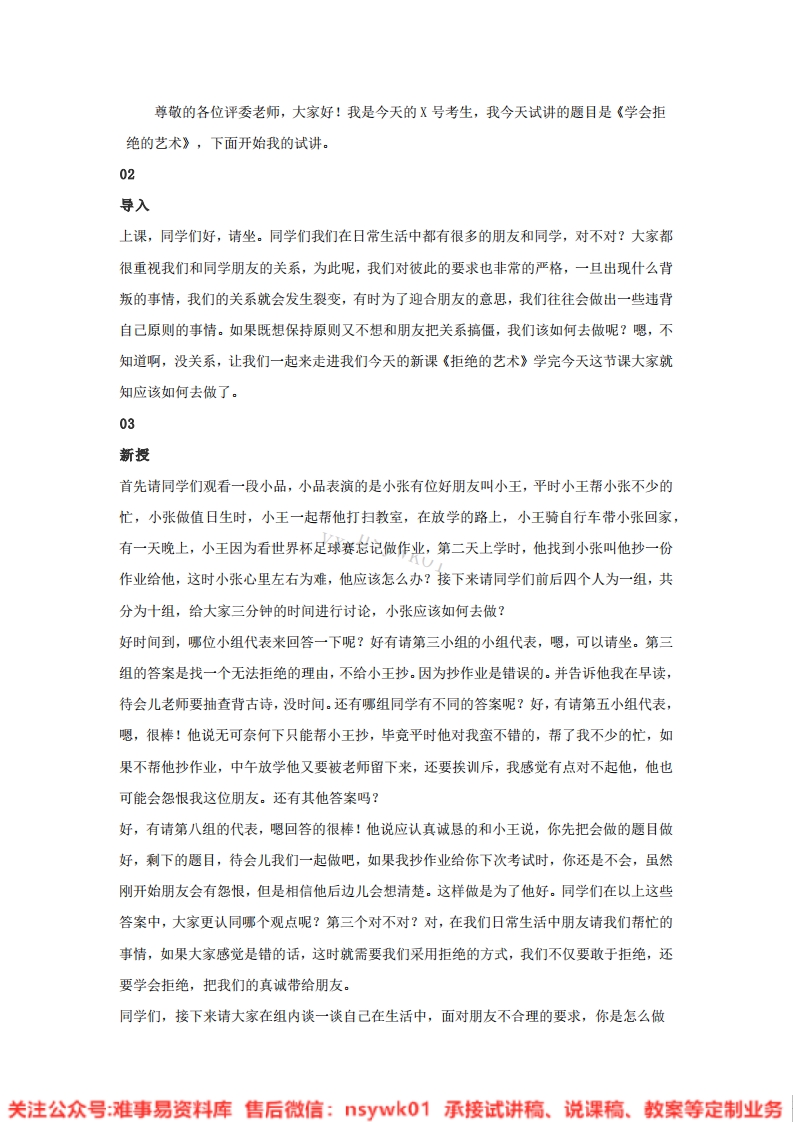尊敬的各位评委老师,大家好!我是今天的X号考生,我今天试讲的题目是《学会拒绝的艺术》,下面开始我的试讲。02导入上课,同学们好,请坐。同学们我们在日常生活中都有很多的朋友和同学,对不对?大家都很重视我们和同学朋友的关系,为此呢,我们对彼此的要求也非常的严格,一旦出现什么背叛的事情,我们的关系就会发生裂变,有时为了迎合朋友的意思,我们往往会做出一些违背自己原则的事情。如果既想保持原则又不想和朋友把关系搞僵,我们该如何去做呢?嗯,不知道啊,没关系,让我们一起来走进我们今天的新课《拒绝的艺术》学完今天这节课大家就知应该如何去做了。03首先请同学们观看一段小品,小品表演的是小张有位好朋友叫小王,平时小王帮小张不少的忙,小张做值日生时,小王一起帮他打扫教室,在放学的路上,小王骑自行车带小张回家,有一天晚上,小王因为看世界杯足球赛忘记做作业,第二天上学时,他找到小张叫他抄一份作业给他,这时小张心里左右为难,他应该怎么办?接下来请同学们前后四个人为一组,共分为十组,给大家三分钟的时间进行讨论,小张应该如何去做?好时间到,哪位小组代表来回答一下呢?好有请第三小组的小组代表,嗯,可以请坐。第三组的答案是找一个无法拒绝的理由,不给小王抄。因为抄作业是错误的。并告诉他我在早读,待会儿老师要抽查背古诗,没时间。还有哪组同学有不同的答案呢?好,有请第五小组代表,嗯,很棒!他说无可奈何下只能帮小王抄,毕竞平时他对我蛮不错的,帮了我不少的忙,如果不帮他抄作业,中午放学他又要被老师留下来,还要挨训斥,我感觉有点对不起他,他也可能会怨恨我这位朋友。还有其他答案吗?好,有请第八组的代表,嗯回答的很棒!他说应认真诚恳的和小王说,你先把会做的题目做好,剩下的题目,待会儿我们一起做吧,如果我抄作业给你下次考试时,你还是不会,虽然刚开始朋友会有怨恨,但是相信他后边儿会想清楚。这样做是为了他好。同学们在以上这些答案中,大家更认同哪个观点呢?第三个对不对?对,在我们日常生活中朋友请我们帮忙的事情,如果大家感觉是错的话,这时就需要我们采用拒绝的方式,我们不仅要敢于拒绝,还要学会拒绝,把我们的真诚带给朋友。同学们,接下来请大家在组内谈一谈自己在生活中,面对朋友不合理的要求,你是怎么做关注公众号:难事易资料库售后微信:5yk01承接试讲稿、说课稿、教案等定制业务的?大家可以讲一些不善拒绝的经历,也可以讲一些巧妙的拒绝别人,又没伤感情的成功经历与组内同伴分享,给大家五分钟开始吧。好时间到,老师听到大家刚才讲的都非常的好,有同学用讲道理的方法,也有同学设身处地的为对方着想的方法,也有采用提出合理建议的方法,嗯,还有改变话题的方法等等,只要我们的拒绝是真诚的,讲究方法的,那么就会得到对方的理解,下面请同学们讨论总结一下拒绝的技巧是什么。下面给大家5分钟的时间开始吧。好,时间到了,哪个小组来说一下呢,有请我们第六小组,嗯,非常好,他说首先要想想自己碰到了一件什么事儿,要真实的说出自己的感受,并且表明拒绝的态度明确,注意场合,不要在大庭广众下拒绝的,最重要的是要说出拒绝的理由,最后,给对方合理的建议。非常的棒并且很全面!接下来让我们来做个练习,某同学要过生日,班里同学商议合伙给他买礼物,而你家中困难经济紧张,如果你是这名同学你会怎么做?好有请左边靠窗的女同学,嗯,非常好请坐,她说呀,会直接说对不起我爸爸妈妈下岗了,家里经济紧张,我不能再给他们增加经济负担,所以买生日礼物就别算我一份,到时我会给他一张自制的贺卡,并给他打电话祝福他。04小结课程就快结束了,哪位同学来帮我们回忆一下我们这节课主要讲了哪些内容呢?好有请最后一排穿黑衣服的男同学,嗯,总结的很全面!05作业及结束语课下请同学们将我们今天所学的内容运用到实际生活中,做一个既有原则又有良好同学关系的好学生!下课。谢谢各位考官,我的试讲到此结束!关注公众号:难事易资料库售后微信:5yk01承接试讲稿、说课稿、教案等定制业务