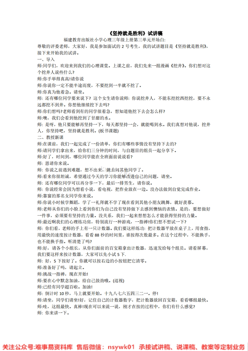 《坚持就是胜利》试讲稿福建教育出版社小学心理三年级上册第三单元开场白:尊敏的评委老师,大家好,我是参加面试的2号考生,我的试讲题目是《坚持就是胜利》,接下来开始我的试讲。一、导入师:同学们,欢迎来到我们的心理课堂。上课之前,我们先来一组漫画《挖井》。你们想对这个挖井人说些什么?师:你手举得真高1请你说师:你说你一定不能半途而废,不要挖到一半就不挖了。师:你真为他着急。请坐。师:还有哪位同学要来说下?这个女生请你说师:你说挖井人,不能东挖挖西挖挖,要不永远都挖不到井。你想他继续挖下去吗?师:你们想吗?老师看到有的同学很着急,想知道他挖下去会怎么样?师:噢,我们会看到他挖到了甘甜的水。师:是呀,他只要能够再坚持一下,每天都坚持一会,就能喝到水。我们真想对他说,挖井人,你坚持吧,坚持就是胜利。(板书课题)二、教授新课师:在课前,我们一起完成了一份清单,你们有哪些事情没有坚持下去的?师:请同学们拿出来,给你们三分钟的时间,与自题目的组员一起分享下。师:好了,时间到,哪位同学能在全班面前说说看?师:恩请你来说。师:你说之前遇到难题,想不出来,就去问其他同学了。师:看来你很坦诚,希望通过今天的学习你能够改进自己的问题,请坐。师:还有哪位同学可以再分享一下,最后一排男生,请你说。师:你说经常会因为想看小说,看电视,把作业放在一边。没办法做到自觉完成作业。师:靠窗的那名女同学你来说。师:你说小时候学舞蹈,学了一礼拜就不学了现在看到其他小朋友跳舞,就好羡慕。师:老师从你们的小脸上看到你们为自己没有坚持做下去感到懊恼的表情。是的,要想做好一件事,必须要有坚持的力量。没关系,我们一起来想想怎么才能获得坚持的力量。师:最近啊我们的心理练功房,特别流行一种游戏,一指禅!你们想不想试一下?师:你们看,老师的手上有一只计数器。我们要这样练功:把计数器平放在桌子上,用食指,用最快的速度按计数器,看看88秒的时间里,谁按得次数最多。在这个过程中,不能换手,也不能换手指。听清楚了吗?师:好,请各个小组长,从你们面前的百宝箱拿出计数器,迅速发给每个组员。请看屏幕,我们要这样来按计数器,大家可以先小试5下.师:好,5下按好了。你就可以按右边的小按钮把它清零。师准备好了吗,请起立。师:挑战一指禅,现在开始!师:要在心中默念加油,给自己鼓劲哦。(巡视)师:己经有同学超百啦。加油!师:倒计时10秒,马上就要开始。十九八七六五四三二一。停1师:请坐,同学们请坐1好,记住自己的计数器数字,把计数器放回百宝箱,看看哪组最快。师:哇,这组最快。真棒现在可以来说一说,刚才在按的过程中,你们有什么感觉?师:你来讲一下。关注公众号:难事易资料库售后微信:5ywk01承接试讲稿、说课稿、教案等定制业务师:噢,你说手上都出汗了,手很酸,那你按了几下?师:女生都按了四百下,这么厉害!师:男生你来说说下,手出汗滑溜溜,很难按师:你按了几下?四百八十一下,还有更多的吗?师:你来说下!师:按了四百九十下,手麻得都提不出来师:老师有看到你的表情,其实蛮累的。师:是呀,我们感到很累,但是都在坚持,真棒同学们,当我们做一件事累的时候,坚持不下去的时候,就是出现一种力量,它就是意志。(板书意志)当感觉很累,但还是能继续坚持下去这就是意志磨砺的过程。在我们平时的生活中就有很有的困难,需要我们用坚强的意志去克服。师:那除了意志之外,我们还需要什么来克服困难呢?三、自主活动师:现在来听听一位年轻人讲述他的故事,大家边听边想,他是如何克服困难的?师:故事听完了,大家想出他是怎么克服困难的吗?师:好,请你来说一下。师:你说听了他爸爸的经验,真聪明。还有吗?师:那名穿红颜色衣服的小朋友你来说,师:没有想出来,我们一起来帮帮他恩,没想出来。没关系,哪位同学可以帮帮他?师:你听得真仔细,砍树也要有合适的工具师:那我们从他身上可以学到什么?·1○师:好,你来说下。你说遇到困难时,可以找别人帮忙。师:你脑瓜子转得可真快啊请坐!师:那同学们,当你们遇到困难时,会想到找谁帮忙?师:噢,你说找同学,老师,家长。师:这位同学,你有其他的补充吗?师:你说除了找人帮忙,我们也可以上网找资料。哇,真聪明I师:同学们,那除了上网,我们是不是也可以用工具书?师:好,那还有哪些途径,大家拿起笔,写下来(板书方法)师:当我们遇到困难时,就把它们利用起来,好不好1四、课堂总结师:同学们,今天我们通过分享交流,游戏和探究活动,明白了面对困难,我们不能轻易放弃要坚持下去,也知道遇到困难后可以寻找帮助。希望同学们在接下来生活中,遇到困难时,能够积极去克服,坚持就是胜利!五、板书设计坚持就是胜利意志方法关注公众号:难事易资料库售后微信:5ywk01承接试讲稿、说课稿、教案等定制业务