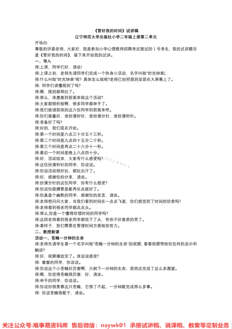 《管好我的时间》试讲稿辽宁师范大学出版社小学二年级上册第二单元开场白:尊敬的评委老师,大家好,我是参加小学心理教师招聘考试面试的1号考生,我的试讲题目是《管好我的时间》,接下来开始我的试讲。一、导入师:上课,同学们好,请坐!师:上课之初,老师先请同学们完成一个热身小活动,名字叫做“时光钟表。师:什么叫做“时光钟表"呢?具体怎么做呢?老师已经把规则呈现在大屏幕上了。师:同学们读懂规则了吗?师嗯,规则都明白了。师:那么,谁愿意到前面来做这个活动?师:大家都很积极啊,很多同学都举手了。师:我们就请前排的这六位同学到前面来吧。师:你们商量好,谁扮演时针,谁扮演分针,谁扮演秒针。师:准备好了吗?师好的,我们现在开始。师:第一个时间是六点三十分五十三秒。师第二个时间是九点四十五分二十秒。师:第三个时间是两点二十六分十一秒。师最后一个时间是晚上八点四十分。师好,活动结束,大家有什么感受吗?1SywK)1师这位扮演秒针的同学,你说说。师你说活动很好玩,都玩出汗了。师好,感谢你的分享,请坐。师扮演分针的这位同学,你有什么感受?师:你说你胳膊要是能再长点就好了。师你真是个幽默的同学,感谢你的发言,请坐。师:老师想问问大家,当我们看到时间在一点点飞逝,你们感觉到了时间的珍贵吗?师老师看到很多同学都点点头。师那么,你是一个懂得珍惜时间的同学吗?师:这回老师看到很多同学都低下了头,有些不好意思的笑了。师看样子,我们需要在管理时间方面做些努力。二、教授新课活动一、苍蝇一分钟的生命师:老师先请学生看一个名字叫做“苍蝇一分钟的生命"的视频,看看视频带给你怎样的启示和触动?师好,视频播放完了。谁说说感受?师:靠窗的同学,你说说。师你说这个小苍蝇好厉害啊,只剩下一分钟的生命,居然还完成了这么多愿望。师:嗯,你觉得苍蝇很厉害,好,请坐。师举手的同学,你说说。师:你说你很羡慕这只苍蝇,它很了不起,一分钟能完成那么多事。师:你说苍蝇很能干,请坐。关注公众号:难事易资料库售后微信:5ywk01承接试讲稿、说课稿、教案等定制业务师:最后请第三排同学说一下。师你说苍蝇没有放弃最后一分钟,而是争分夺秒地活着,这种精神值得称赞。师:你说的很好,请坐。师让我们掌声感谢几位同学们的分享。师:一分钟看似很短,但如果能充分利用好每一分钟,就能创造很大的价值,像这只小苍蝇样,没有遗憾,愿同学们也能把握好自己拥有的每一分钟。活动二、谁的时间规划更合理师:然而,很多同学没有认识到时间的珍贵,平时浪费了很多时间,非常可惜。师老师在大屏幕上呈现了小明和小美两个人一天的作息时间表。师:请同学们比较一下两个人的作息时间,你们觉得谁的时间安排更合理呢?师:手举的最高的同学,你来说。师:你说小刚玩游戏的时间太长了,会浪费很多时间的,睡觉时间有点晚,这样不利于身体发育,吃饭也有些拖沓,这些都需要改进。师:嗯,老师也同意你的看法,说的不错,请坐。师:这位女同学你说说。你说小美把时间安排的很合理,既有学习时间,还有其他娱乐的时间,晚上还能保证充足的睡眠,时间规划的很好。师:同学们,我们每个人一天的时光都是24小时,谁也不多,谁也不少,然而,有的同学能在有限时间内做很多事,而有的同学,总觉得时间不够用,做事拖沓,其关键就在于,我们应该懂得管理好时间。三、自主活动活动三、我的时间计划表师:既然,我们知道小刚的时间计划有不合理之处,也知道了小美的时间计划值得我们借鉴,下面老师就请各位同学根据自己的实际情况,做出一份属于自己的时间计划表。师:同学们可以按照表格的形式,设计时间计划表,老师已经把样例呈现在大屏幕上了,大家可以参考设计。师现在开始。师好,活动结束。大家的时间计划表都设计的如何?师:请同学们互相传看,借鉴学习一下。师:同学们,也许曾经,我们没有想过如何时间管理,导致很多时间都被浪费掉了,非常可惜,但是今天,大家都做了自己的时间计划表,那么,我们要以它为参考,指导我们的学习与生活。四、总结师:好了,同学们,本节课到这,就要接近尾声了,总结本堂课来说,通过今天的学习,我们认识到了时间是非常宝贵的,它是我们最珍贵的财富,是用多少金钱也换不来的。师:因此,我们要珍惜每分每秒,不虚度时光,管好自己的时间,是一项非常重要的事情,也是一种能力。希望今天的课能给同学们带来一定的启示!师好,这节课就到这里,同学们,下课!五、板书设计管理我的时间1.热身活动"时光钟表”2苍蝇一分钟的生命3.时间的合理规划关注公众号:难事易资料库售后微信:5ywk01承接试讲稿、说课稿、教案等定制业务