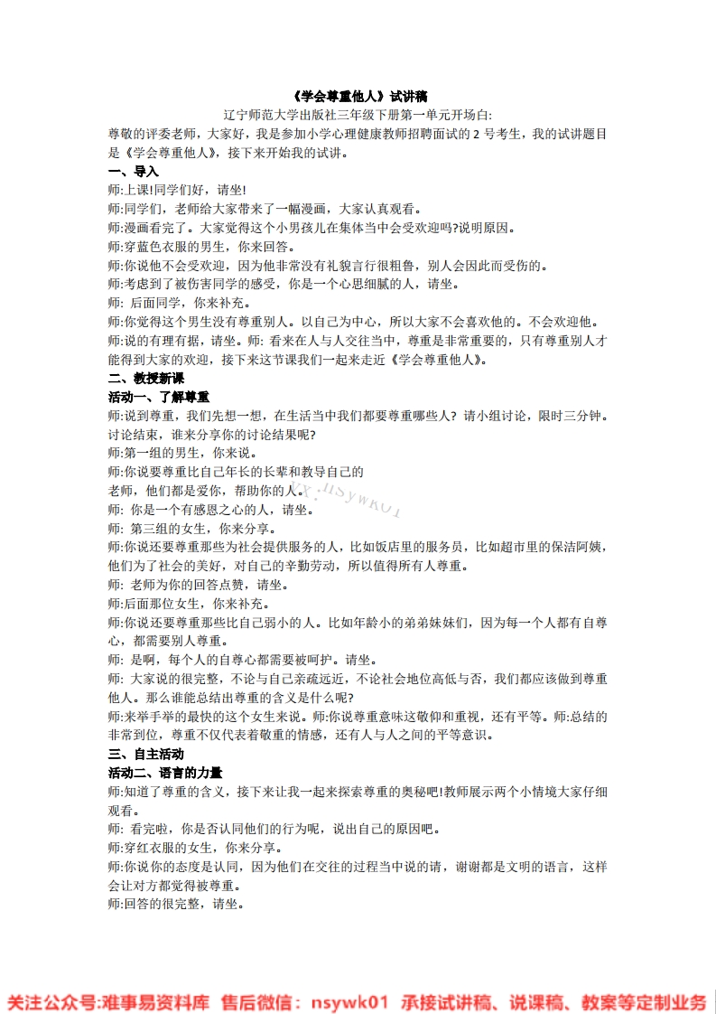 《学会尊里他人》试讲稿辽宁师范大学出版社三年级下册第一单元开场白:尊敬的评委老师,大家好,我是参加小学心理健康教师招聘面试的2号考生,我的试讲题目是《学会尊重他人》,接下来开始我的试讲。一、导入师:上课1同学们好,请坐1师:同学们,老师给大家带来了一幅漫画,大家认真观看。师:漫画看完了。大家觉得这个小男孩儿在集体当中会受欢迎吗?说明原因。师:穿蓝色衣服的男生,你来回答。师:你说他不会受欢迎,因为他非常没有礼貌言行很粗鲁,别人会因此而受伤的。师:考虑到了被伤害同学的感受,你是一个心思细腻的人,请坐。师:后面同学,你来补充。师:你觉得这个男生没有尊重别人。以自己为中心,所以大家不会喜欢他的。不会欢迎他。师:说的有理有据,请坐。师:看来在人与人交往当中,尊重是非常重要的,只有尊重别人才能得到大家的欢迎,接下来这节课我们一起来走近《学会尊重他人》。活动一、了解尊重师:说到尊重,我们先想一想,在生活当中我们都要尊重哪些人?请小组讨论,限时三分钟。讨论结束,谁来分享你的讨论结果呢?师:第一组的男生,你来说。师:你说要尊重比自己年长的长辈和教导自己的师:你是一个有感恩之心的人,请坐。师:第三组的女生,你来分享。师:你说还要尊重那些为社会提供服务的人,比如饭店里的服务员,比如超市里的保洁阿姨,他们为了社会的美好,对自己的辛勒劳动,所以值得所有人尊重。师:老师为你的回答点赞,请坐。师:后面那位女生,你来补充。师:你说还要尊重那些比自己弱小的人。比如年龄小的弟弟妹妹们,因为每一个人都有自尊心,都需要别人尊重。师:是啊,每个人的自尊心都需要被呵护。请坐。师:大家说的很完整,不论与自己亲疏远近,不论社会地位高低与否,我们都应该做到尊重他人。那么谁能总结出尊重的含义是什么呢?师:来举手举的最快的这个女生来说。师:你说尊重意味这敏仰和重视,还有平等。师:总结的非常到位,尊重不仅代表着敬重的情感,还有人与人之间的平等意识。三、自主活动活动二、语言的力量师:知道了尊重的含义,接下来让我一起来探索尊重的奥秘吧!教师展示两个小情境大家仔细观看。师:看完啦,你是否认同他们的行为呢,说出自己的原因吧。师:穿红衣服的女生,你来分享。师:你说你的态度是认同,因为他们在交往的过程当中说的请,谢谢都是文明的语言,这样会让对方都觉得被尊重。师:回答的很完整,请坐。关注公众号:难事易资料库售后微信:5ywk01承接试讲稿、说课稿、教案等定制业务师:大家思考一下,生活当中还有哪些礼貌用语师:你说在得到别人的帮助之后,要说谢谢,或者辛苦了。师:充分表达自己的谢意,请坐。师:同桌,你来补充。师:你说和比自己年长的人说话时要。注意自己的称谓。尊称对方您。师:注意到了自己的辈份,请坐。师:大家想的都很周到啊,良言一句三冬暖。在和别人交往的过程当中,我们一定不要忽视语言的力量,尊重他人,首先请做到文明用语。活动三、行为的力量师:除了文明用语,你还知道哪些尊重他人的“妙招”,学生小组之间进行讨论,限时三分钟,现在开始。师:讨论结束,谁来分享你的讨论结果。师:第一个举手的这名男生,你来说。师:你说在别人表达的时候要认真倾听,不随意打断,尊重对方的发言,这样才能更好的交流。师:你一定是一个很棒的倾听者,请坐。师:后面的女生你来分享。师:你说当别人在集中注意力看书和学习,或者思考的时候,尽量不打扰别人,别人方便的时候再提出自己的要求。师:学会等待,很好,请坐。师:红衣服的女生,你来补充。师:你说进入办公室或者别人家之前,敲门要轻轻的敲。防止太大的敲门声,吓到屋里面的人。很细心,请坐。师:看来尊重他人,不光要注意文明用语还要严格约束自己的行为。四、总结师:不知不觉中,这节课就要结束了,你们收获了什么呢?师:中间这位女同学你来说。师:你说你知道了尊重的重要性,你以后要在语言和行为上都做到尊重他人。师:老师相信你一定能做到。请坐。师:尊重他人应该成为一种习惯,有温度的语言和礼貌的行为会让你收到更多人的欢迎,老师希望同学们能够将今天课上学习到的尊重的方法应用到生活和学习以至于你们日后的人生当中老师相信你们的未来一定会更加光明!师:同学们,下课!五、板书设计学会尊重他人语言:文明用语尊重尊敬重视平等行为:礼貌谦和关注公众号:难事易资料库售后微信:5yk01承接试讲稿、说课稿、教案等定制业务