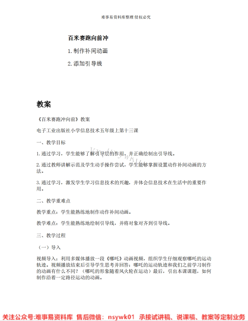 难事易资料库整理侵权必究百米赛跑向前冲1.制作补间动画2.添加引导线教案《百米赛跑冲向前》教案电子工业出版社小学信息技术五年级上第十三课一、教学目标1.通过学习,学生能够了解引导层的作用,并正确绘制出引导线。2.通过教师讲解示范及学生动手操作尝试,学生能够掌握设置动作补间动画的方法。3.通过学习,激发学生学习信息技术的兴趣,并体会信息技术在生活中的重要作用。二、教学重难点教学重点:学生能熟练地制作动作补间动画。教学难点:学生能熟练地绘制引导线,并将对象对齐到引导线。三、教学过程(一)导入视频导入:利用多媒体播放一段《哪吒》动画视频,组织学生仔细观察哪吒的运动轨迹。视频播放结束后引导学生思考并回答:哪吒的运动轨迹和我们之前学习制作的动画有什么不同?(哪吒的形象随着风火轮在运动)最后,引出本课课题,如何制作沿着一定路径运动的动画。关注公众号:难事易资料库售后微信:5ywk01承接试讲稿、说课稿、教案等定制业务难事易资料库整理侵权必究(二)教授新课1.制作补间动画(1)师生合作,共同打开指定位置下的文档《跑步》。(2)教师向学生演示示范制作动作补间动画的方法:拖动元件至舞台跑道的左侧,在第1帧处选择“任意变形”工具,将元件的中心点拖到至人物的脚尖位置,在第150帧处插入关键帧并移动对象至终点处,最后在任意一帧的位置展开“属性”面板,设置“动作”补间动画。(3)学生模仿操作动作补间动画的制作,教师巡视指导。2.添加引导线(1)教师介绍引导层(使动画对象沿着一定的复杂路径移动,就需要预先设定好运动路径,而运动的路径必须放入单独的引导层中,这样才能使被引导层中的对象按照指定的引导路径来运动)指导学生参照教材内容,独立尝试添加引导层。(2)邀请学生代表演示自己的操作方法。(3)布置小组合作任务:借助微课视频,在引导层中绘制引导线,并测试影片,教师适时巡视并指导。(4)邀请小组代表介绍操作注意事项。(调整路径线条时要等鼠标指针变形后操作:动画对象一定要吸附到引导线上)(三)练习组织学生独立对《放风筝》文档进行动画设置,并组织学生对作品进行展示和评价。(四)小结组织学生交流并分享本节课的收获,引导学生进一步明确制作动作补间动画的方法,熟练添加引导层并绘制出引导线,提醒学生可以根据引导线的不同效果选择不同的工具来绘制。(五)作业回家为《小猫钓鱼》文档添加引导层动画并将作品和父母分享。本文字数896字,同学们根据面试时长进行增减。关注公众号:难事易资料库售后微信:5ywk01承接试讲稿、说课稿、教案等定制业务