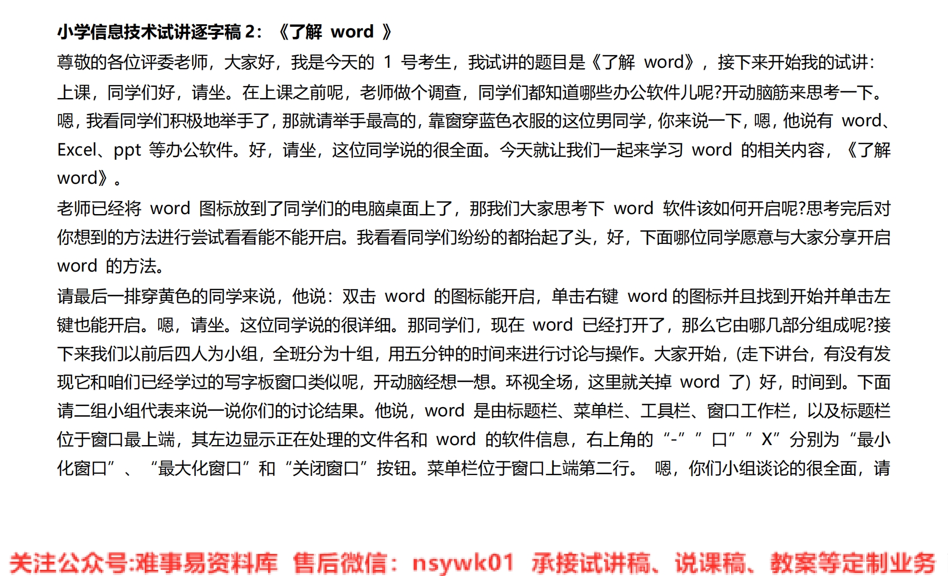小学信息技术试讲逐字稿2:《了解word》尊敬的各位评委老师,大家好,我是今天的1号考生,我试讲的题目是《了解wod》,接下来开始我的试讲:上课,同学们好,请坐。在上课之前呢,老师做个调查,同学们都知道哪些办公软件儿呢?开动脑筋来思考一下。嗯,我看同学们积极地举手了,那就请举手最高的,靠窗穿蓝色衣服的这位男同学,你来说一下,嗯,他说有WOd、Excl、ppt等办公软件。好,请坐,这位同学说的很全面。今天就让我们一起来学习word的相关内容,《了解word》老师已经将word图标放到了同学们的电脑桌面上了,那我们大家思考下word软件该如何开启呢?思考完后对你想到的方法进行尝试看看能不能开启。我看看同学们纷纷的都抬起了头,好,下面哪位同学愿意与大家分享开启word的方法。请最后一排穿黄色的同学来说,他说:双击word的图标能开启,单击右键word的图标并且找到开始并单击左键也能开启。嗯,请坐。这位同学说的很详细。那同学们,现在wod已经打开了,那么它由哪几部分组成呢?接下来我们以前后四人为小组,全班分为十组,用五分钟的时间来进行讨论与操作。大家开始,(走下讲台,有没有发现它和咱们已经学过的写字板窗口类似呢,开动脑经想一想。环视全场,这里就关掉wod了)好,时间到。下面请二组小组代表来说一说你们的讨论结果。他说,wOd是由标题栏、菜单栏、工具栏、窗口工作栏,以及标题栏位于窗口最上端,其左边显示正在处理的文件名和wod的软件信息,右上角的”-””口””X”分别为“最小化窗口”、“最大化窗口”和“关闭窗口”按钮。菜单栏位于窗口上端第二行。嗯,你们小组谈论的很全面,请关注公众号:难事易资料库售后微信:sywk01承接试讲稿、说课稿、教案等定制业务坐。那文档窗口在什么位置?我们请最后一排最右边的同学来说,这名同学说,文档窗口位于wod窗口的中央,用于文档的输入和编排。其中闪烁着的竖线形光标称为插入点,用于指示文字输入的位置。嗯,这位同学说的很详细,而且声音非常洪亮。请坐。接下来,我们用开火车的方式来一起回答下wod界面中的对应的相对图标。从第一排开始,跟着老师的鼠标,依次来进行回答,“标题栏、菜单栏、工具栏、文档窗口、状态栏”嗯,同学们回答的都非常棒,看来大家对图标都记得很清楚。04小结美好的时间总是短暂的,最后我们请今天的小小电脑家来回顾今天都学习了哪些内容?请第一排穿红色外套的女生,她说:我们学习了如何启动Wod,之后学习了Word都有哪几部分组成,又简单介绍了图标的位置。嗯,非常棒,请坐。通过今天的学习大家对wod一定有了更深的认识那我们在课后的时候找找wod软件中还有哪些功能,下节课与同学们一起分享。下课,同学们,再见。以上就是我全部的试讲内容,感谢各位考官的耐心聆听,各位考官辛苦了!关注公众号:难事易资料库售后微信:5yk01承接试讲稿、说课稿、教案等定制业务