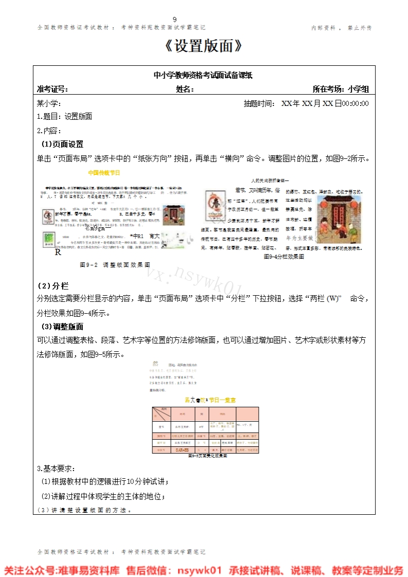 《设置版面》中小学教师资格考试面试备课纸姓名:所在考场:小学组某小学:抽题时间:X年X月X日00:00:002.内容:(1)页面设置单击“页面布局”选项卡中的“纸张方向”按钮,再单击“横向”命令。调整图片的位置,如图9-2所示。aR(2)分栏分别选定需要分栏显示的内容,单击“页面布局”选项卡中“分栏”下拉按钮,选择“两栏(W”命令,分栏效果如图9-4所示。(3)调整版面可以通过调整表格、段落、艺术字等位置的方法修饰版面,也可以通过增加图片、艺术字或形状素材等方法修饰版面,如图9-5所示。然3.基本要求:(1)根据教材中的逻辑进行10分钟试讲;(2)讲解过程中体现学生的主体的地位;(3)讲清楚设置版面的方法。关注公众号:准事易资料库售后微信:5ywk01承接试讲稿、说课稿、教案等定制业务全国教师资格证考试教材:考神资料苑教资面试学霸笔记内部资料,禁止外传《设置版面》教案一、教学日标1.知识与技能目标:能够独立自主且准确地进出行纸张方向、分栏效果的设置,能调整表格、艺术字到合适2.过程与方法目标:通过观察教师演示、小组合作探究,提高观察、合作交流的能力;3.情感态度和价值观目标:通过对文章进行饰,感受WPS软件的神奇,提升审美情趣。二、教学重难点1.教学重点:纸张方向、分栏效果的设置。2教学滩点:灵活设置版面,达到美观的效果。三、教学方法讲授法、演示法、讨论法。四、教学过程〔一)导入新课教师提问学生最喜欢的中国传统节日是什么在学生回答春节、中秋节等后,再通过多媒体出标关于节日的精美的文章,教师续提出问题:你们能否根据我们之前学过的软件设计这样的效果,我们经常见到的些文字效果又是如问完成的通过这些问题顺势导入本节新课。(二)新课讲授1.页面设置采用教师演示、学生观察的教学方法完成这一任务的教学。教师在计算机上进行演示完整的操作步骤:单击“页面布局”→选择“纸张方向”→单击“横向”。再将教学素材提供给学生,在教师演示完成后,教师可以组织学生按照刚才教师的操作步骤和书上的图片提示,自己动手进行操作,然后请操作得又快又好的同学进行演示,演示完成后可以表扬学生上课认真听讲,动手操作能力强。并鼓操作熟练的同学帮助身边同学完操作任务。2.分栏教师采用小组讨论的方式进行第二部都分内容的教学,让学生以相邻4人为一小组,在组内讨论如何实现分栏效果,限时3分钟,讨论结束后请小组代表回答问题。【先选中要操作的目标内容→接着选中页面布局”选项卡→选择“分栏”→最后选择想要的栏数即可。】教师评价这组学生是全组学生都在参与讨论,大家都贡献了自己的力量,其他组同学要向他们学习。3.调整版面教师采用自主探究的方式进行这一部分内容的教学。教师首先向学生展示一幅作品,作品由文字、表格、图片、艺术字等素材组成,但是图片位置与周围文字并不相匹配,有的地方艺术字与图片重蟊了。表格超出顷边距了。提问同学们需要通过哪些方法设置版面呢学生观察后不滩回答。【可以调整图片、艺术字、表格的位置来设器版面。】教师表扬大家观察很仔细。并补充说明:还可以增加图片、艺术字、形状素材等方式,让版面看起来更为美观。接下来组织学生选取自己喜欢的方式设置这幅作品的版面,并在全班进行评比。全国教师资格证考试教材:考神资料苑教资面试学霸笔记关注公众号:难事易资料库售后微信:5ywk01承接试讲稿、说课稿、教案等定制业务