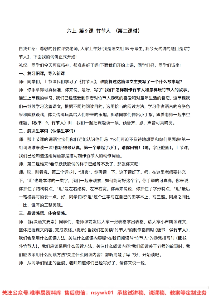 首页试讲逐字稿小学语文统编版-小学语文6年级上册《竹节人二课时》试讲逐字稿
