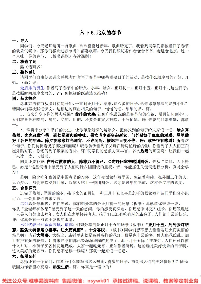 首页试讲逐字稿小学语文统编版-小学语文6年级下册《6.北京的春节》试讲逐字稿