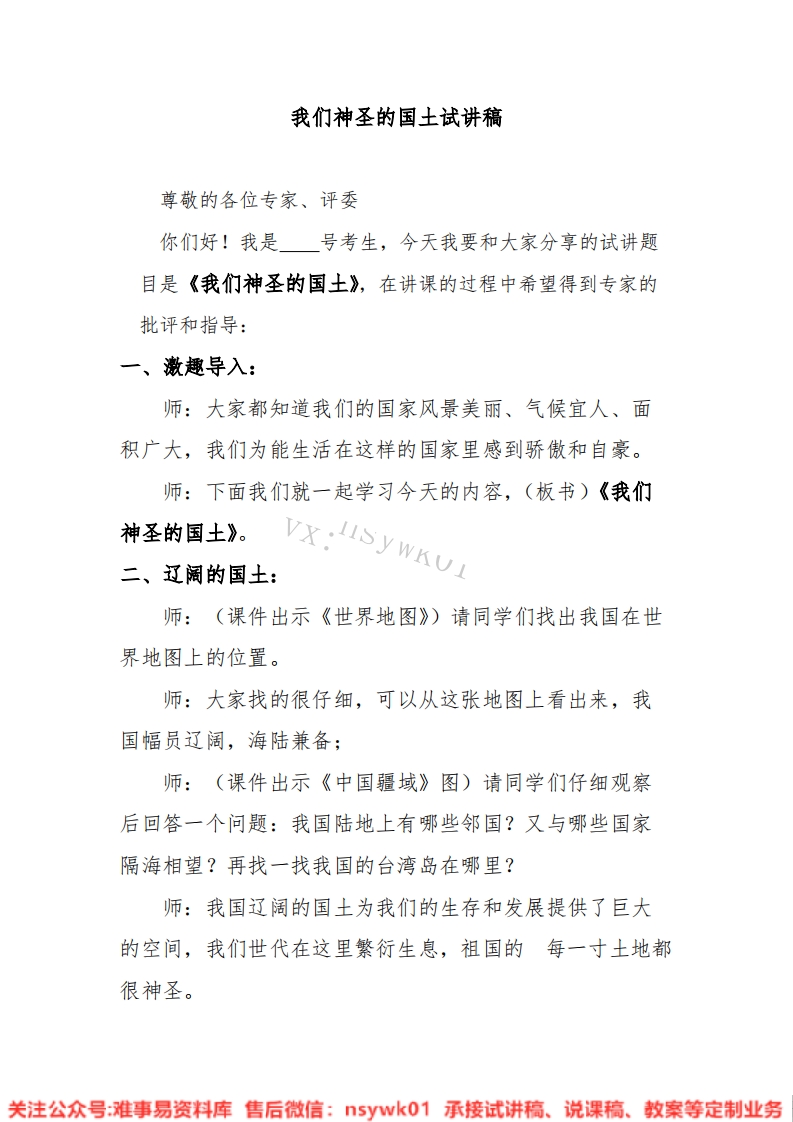 小学道德法制《我们神圣的国土》试讲逐字稿【免费质量一般】.ad2f12a16fe9f315c2703dd56d35fb61