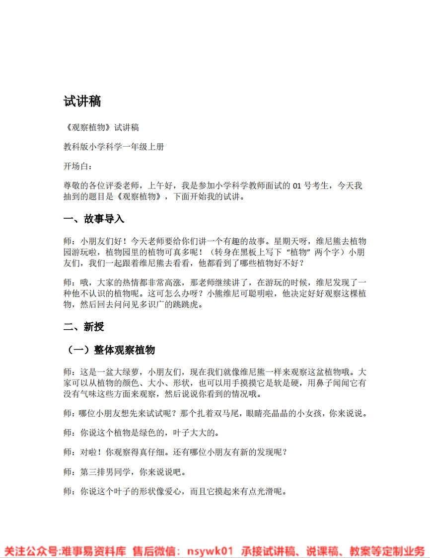 首页试讲逐字稿小学科学教科版-科学《12.观察植物》试讲逐字稿